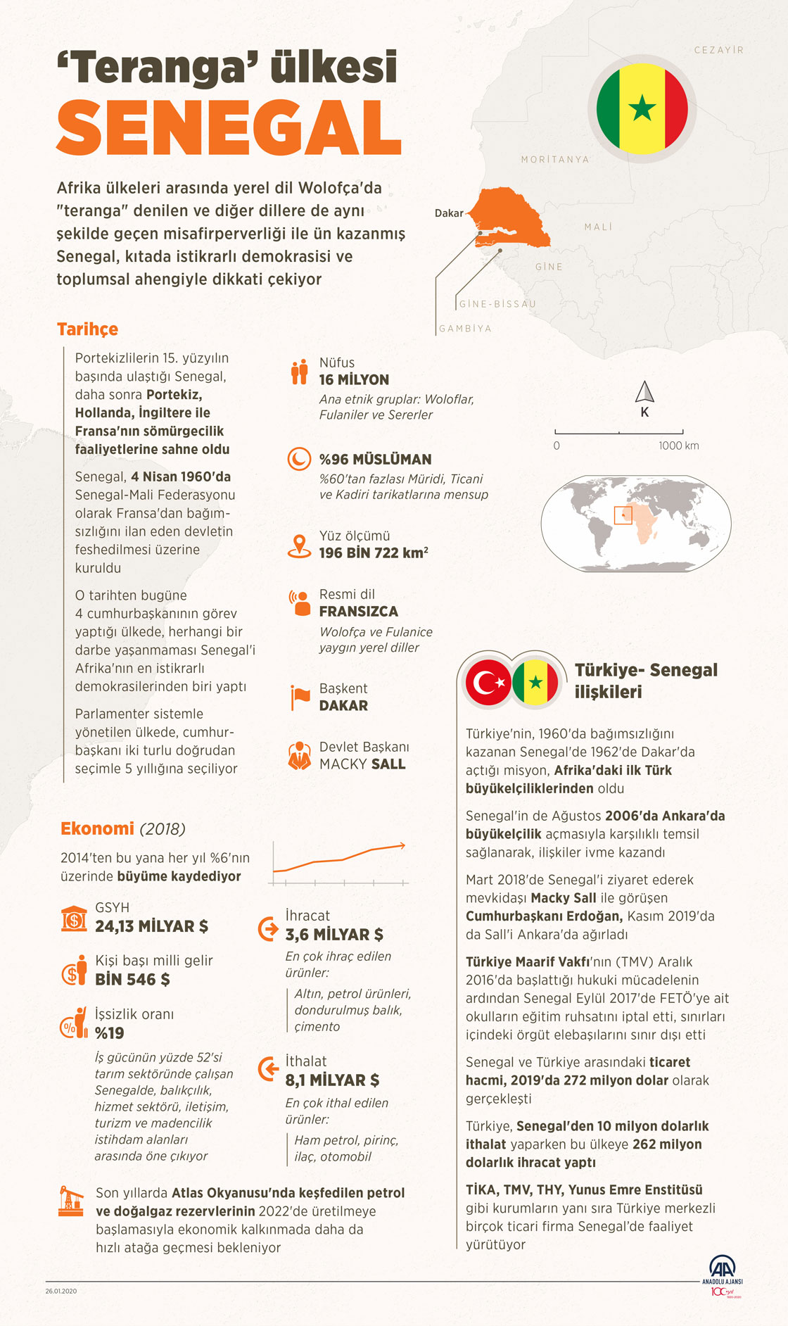 Afrika ülkeleri arasında yerel dil Wolofça'da "teranga" denilen ve diğer dillere de aynı şekilde geçen misafirperverliği ile ün kazanmış Senegal, kıtada istikrarlı demokrasisi ve toplumsal ahengiyle dikkati çekiyor. ( Elmurod Usubalıev - Anadolu Ajansı )