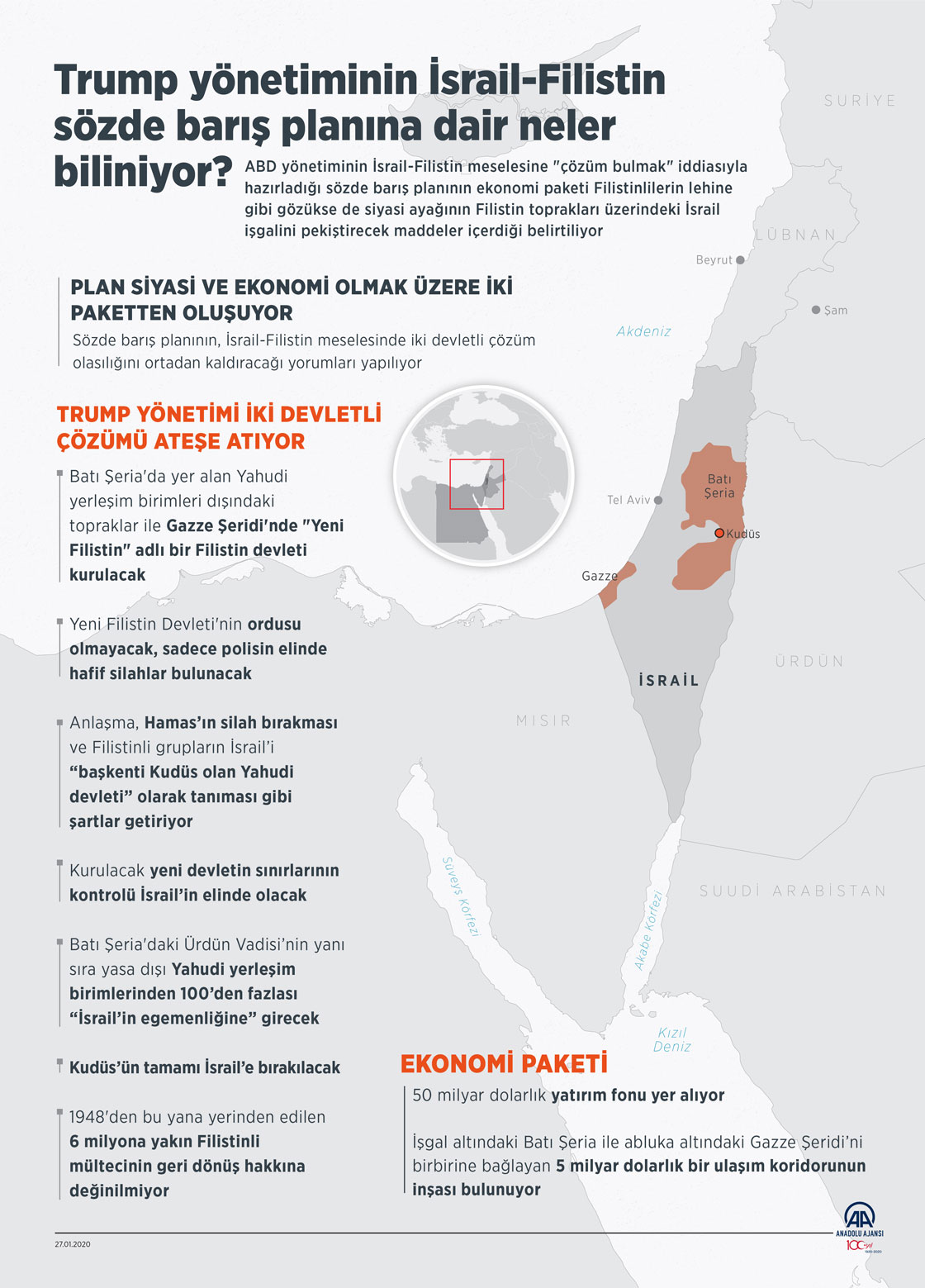 ABD yönetiminin İsrail-Filistin meselesine "çözüm bulmak" iddiasıyla hazırladığı sözde barış planının ekonomi paketi Filistinlilerin lehine gibi gözükse de siyasi ayağının Filistin toprakları üzerindeki İsrail işgalini pekiştirecek maddeler içerdiği belirtiliyor. ( Muhammed Ali Yiğit - Anadolu Ajansı )27 Ocak 2020•Güncelleme: 27 Ocak 2020