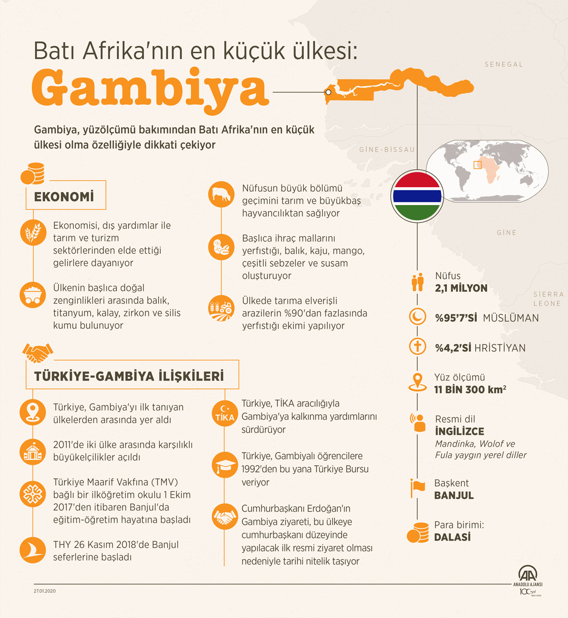 Türkiye Cumhurbaşkanı Recep Tayyip Erdoğan'ın 26-28 Ocak'ta ziyaret etmesi öngörülen Afrika ülkeleri arasında yer alan Gambiya ile ekonomik ve ticari iş birliğinin geliştirilmesi için turizm, inşaat ve tarım alanları "potansiyel sektörler" olarak değerlendiriliyor. Grafik: Muhammed Ali Yiğit/AA27 Ocak 2020•Güncelleme: 27 Ocak 2020