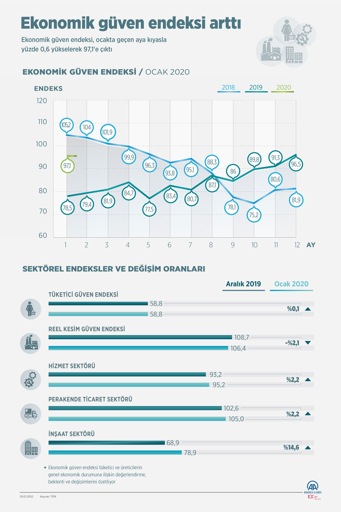 Türkiye İstatistik Kurumu, ocak ayına ilişkin ekonomik güven endeksini açıkladı. Ekonomik güven endeksi, ocakta geçen aya kıyasla yüzde 0,6 yükselerek 97,1'e çıktı. ( Mahmut Resul Karaca - Anadolu Ajansı )