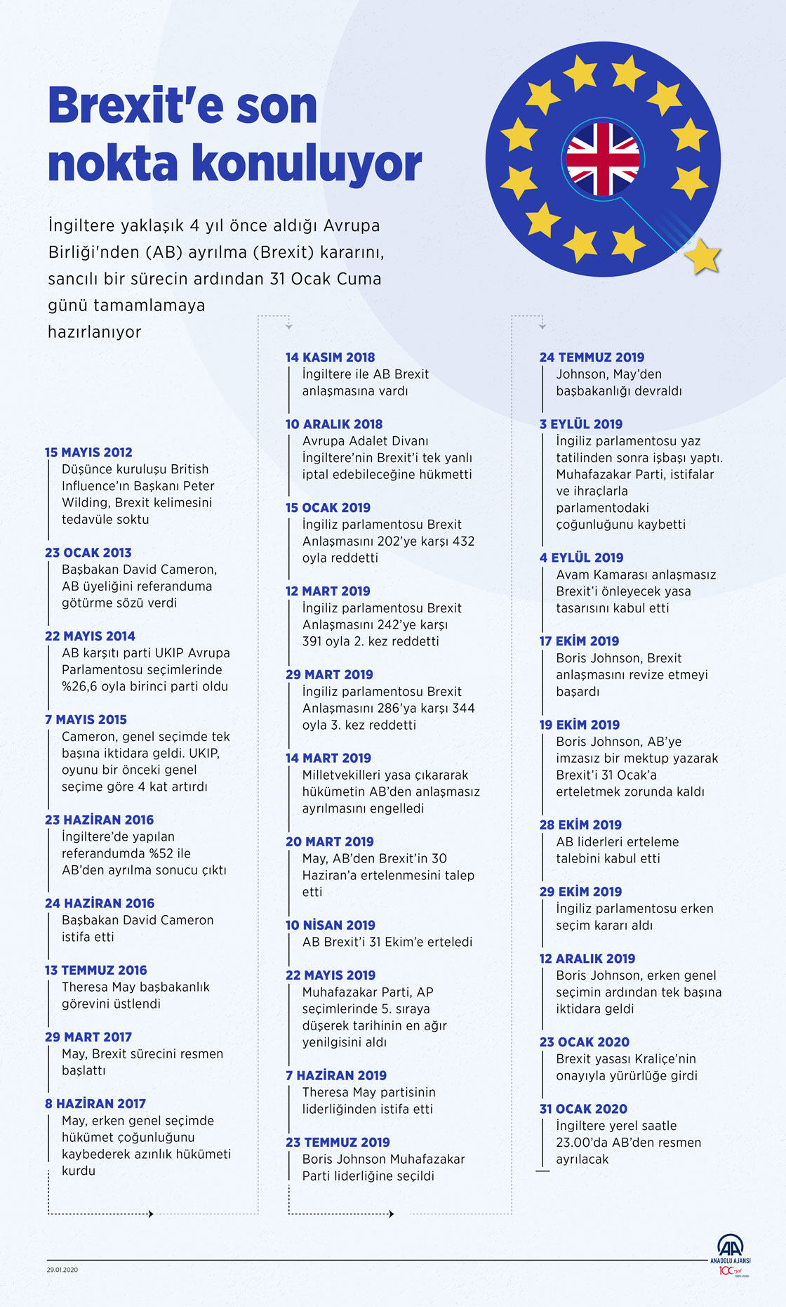 İngiltere yaklaşık 4 yıl önce aldığı Avrupa Birliği'nden (AB) ayrılma (Brexit) kararını, sancılı bir sürecin ardından 31 Ocak Cuma günü tamamlamaya hazırlanıyor. ( Kemal Delikmen - Anadolu Ajansı )