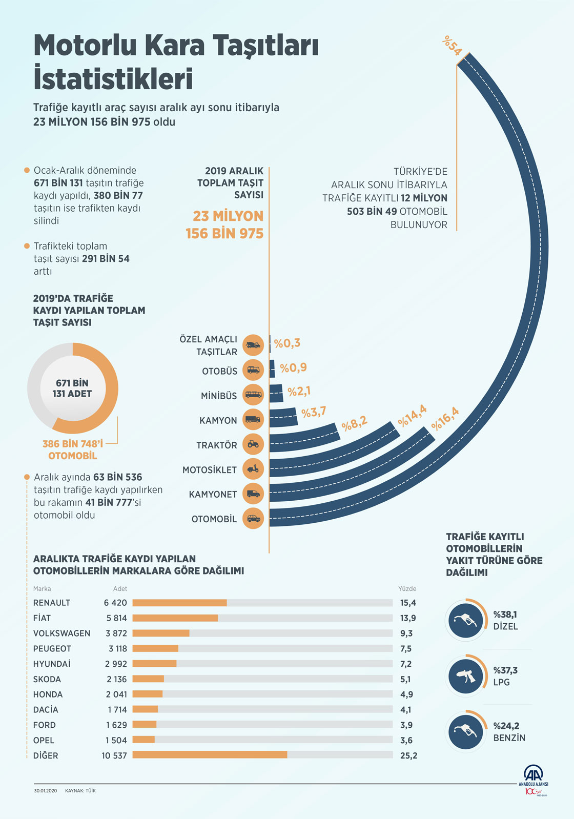 Türkiye İstatistik Kurumu, Aralık 2019'a ilişkin "Motorlu Kara Taşıtları İstatistikleri"ni açıkladı. Trafiğe kayıtlı araç sayısı, geçen yıl bir önceki yıla göre yüzde 1,27 artarak 22 milyon 865 bin 921'den 23 milyon 156 bin 975'e çıktı. Geçen yıl ocak-aralık döneminde trafiğe 671 bin 131 taşıtın kaydı yapılırken, 380 bin 77 taşıtın kaydı silindi. Böylece trafikteki toplam taşıt sayısı 291 bin 54 arttı. ( Mahmut Resul Karaca - Anadolu Ajansı )30 Ocak 2020•Güncelleme: 30 Ocak 2020
