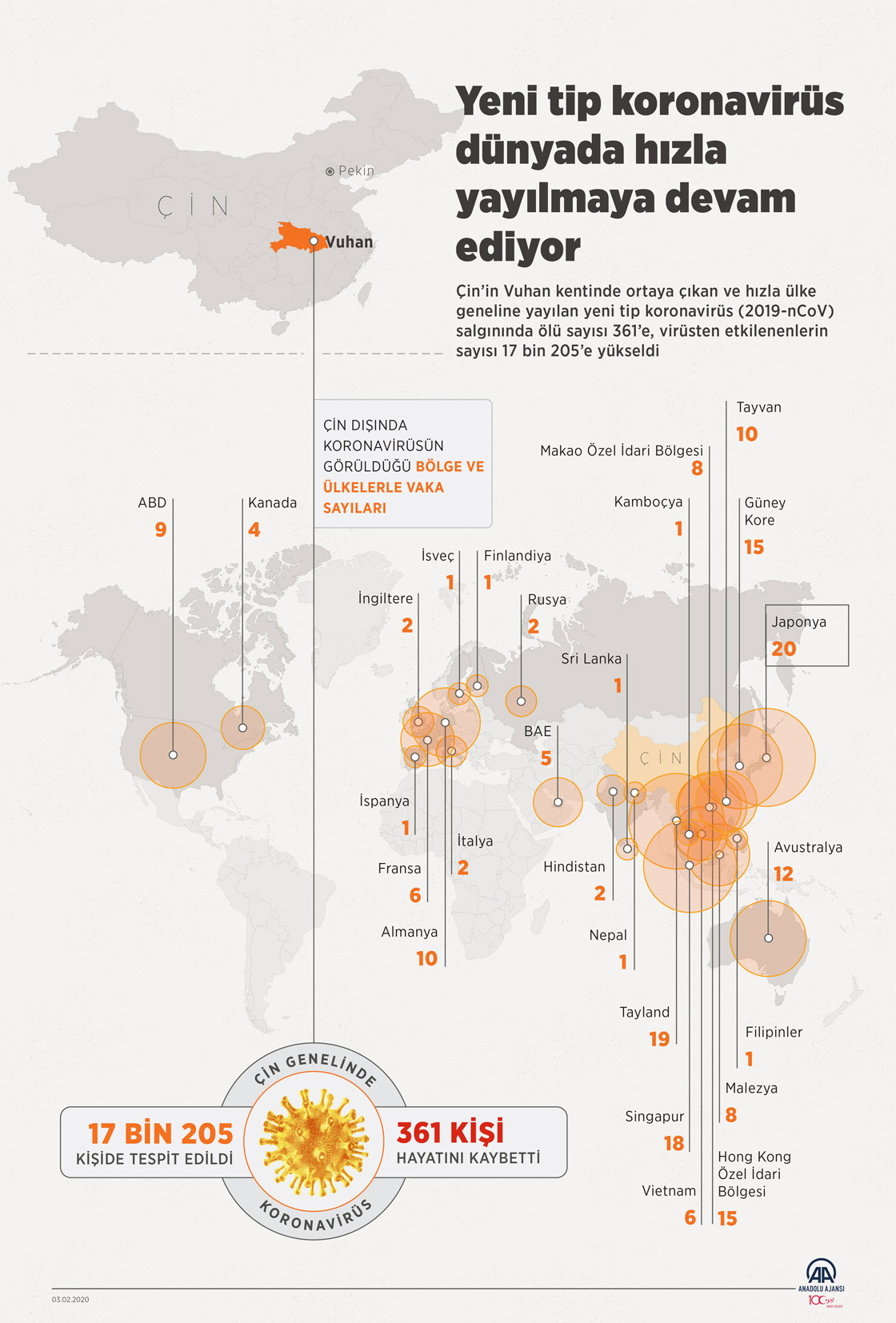 Çin’in Vuhan kentinde ortaya çıkan ve hızla ülke geneline yayılan yeni tip koronavirüs (2019-nCoV) salgınında ölü sayısı 361’e, virüsten etkilenenlerin sayısı 17 bin 205’e yükseldi. Virüsün bulaştığı şüpheli olan kişilerin sayısı 21 bin 558’e ulaşırken, müşahade altına alınan kişi sayısı 152 bin 700’e çıktı. ( Ahmet Burak Özkan - Anadolu Ajansı )03 Şubat 2020•Güncelleme: 03 Şubat 2020