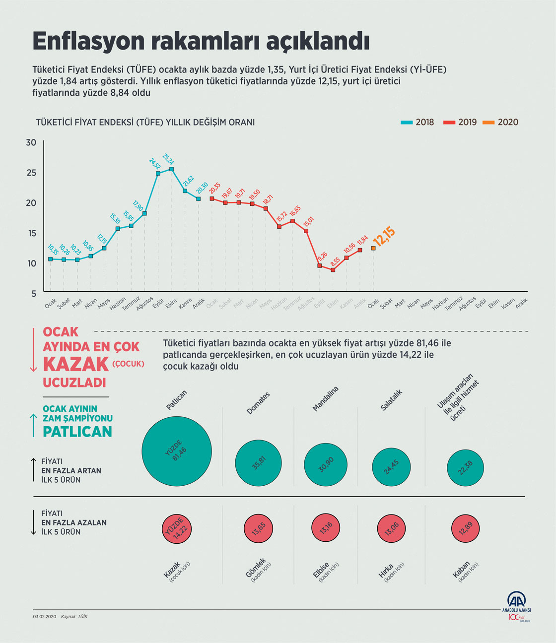 Türkiye İstatistik Kurumu (TÜİK) verilerine göre, Tüketici Fiyat Endeksi (TÜFE) ocakta aylık bazda yüzde 1,35, Yurt İçi Üretici Fiyat Endeksi (Yİ-ÜFE) yüzde 1,84 artış gösterdi. Yıllık enflasyon tüketici fiyatlarında yüzde 12,15, yurt içi üretici fiyatlarında yüzde 8,84 oldu. Tüketici fiyatları bazında ocakta en yüksek fiyat artışı yüzde 81,46 ile patlıcanda gerçekleşirken, en çok ucuzlayan ürün yüzde 14,22 ile çocuk kazağı oldu.