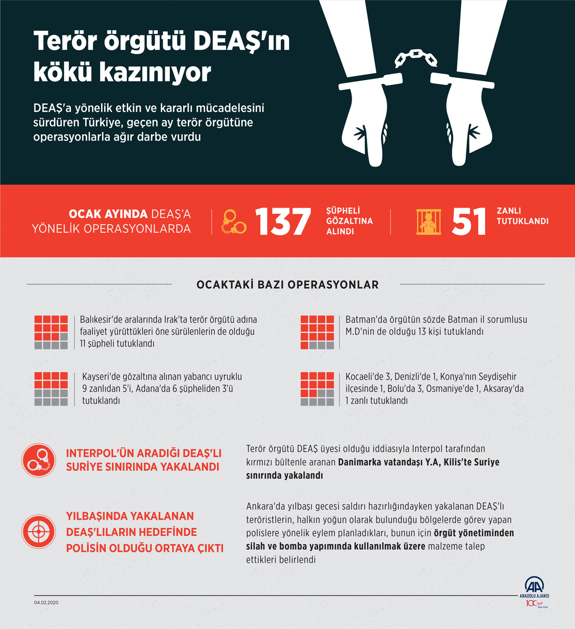 Terör örgütü DEAŞ'a karşı etkin ve kararlı mücadelesini sürdüren Türkiye, geçen ay terör örgütüne operasyonlarla ağır darbe vurdu. Türkiye genelinde çoğu şafak vakti düzenlenen operasyonlarla DEAŞ mensuplarına göz açtırılmadı, ocak ayında aralarında örgütün sözde sorumlularının da bulunduğu 51 şüpheli tutuklandı ( Kemal Delikmen - Anadolu Ajansı )04 Şubat 2020•Güncelleme: 04 Şubat 2020