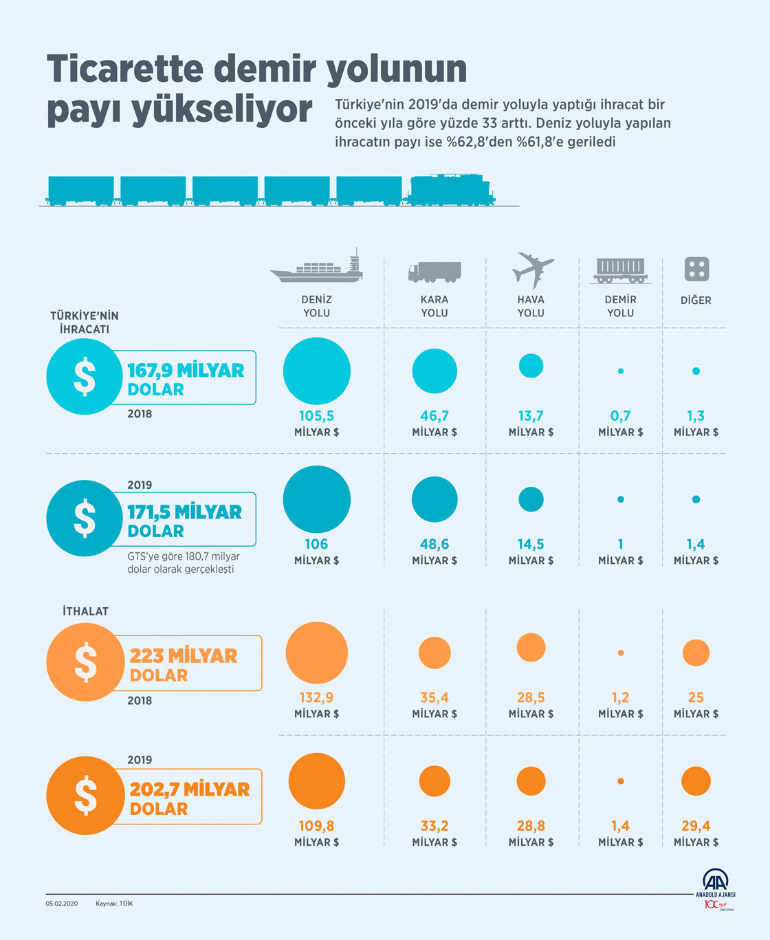 Türkiye'nin 2019'da demir yoluyla yaptığı ihracat bir önceki yıla göre yüzde 33 arttı. Deniz yoluyla yapılan ihracatın payı ise %62,8'den %61,8'e geriledi. ( Muhammed Ali Yiğit - Anadolu Ajansı )