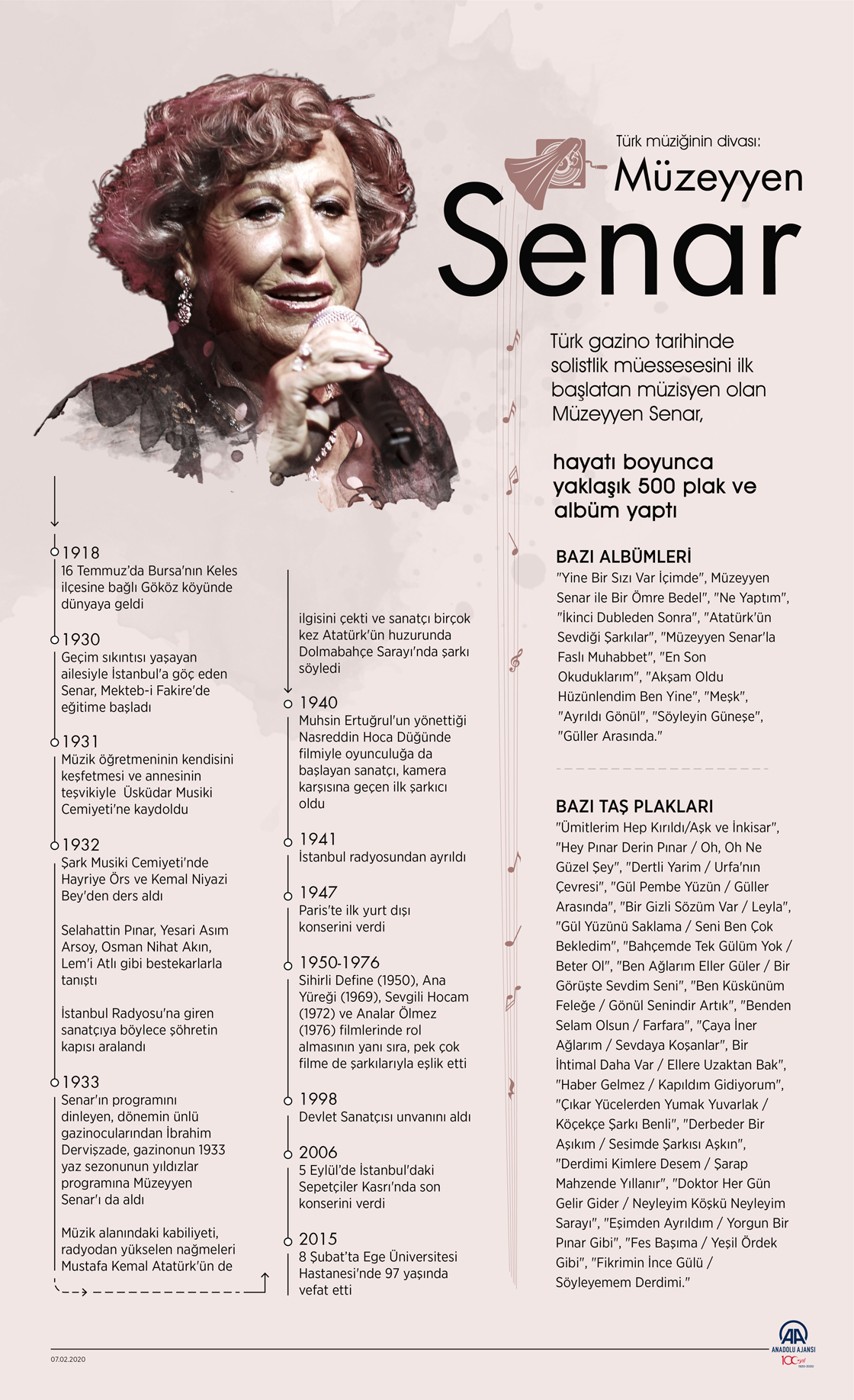 Türk sanat müziğinin en önemli sanatçılarından "Cumhuriyetin Divası" olarak anılan Müzeyyen Senar, Hayatı boyunca yaklaşık 500 plak ve albüm yaptı. (Grafik: Ahmet Burak Özkan/AA)