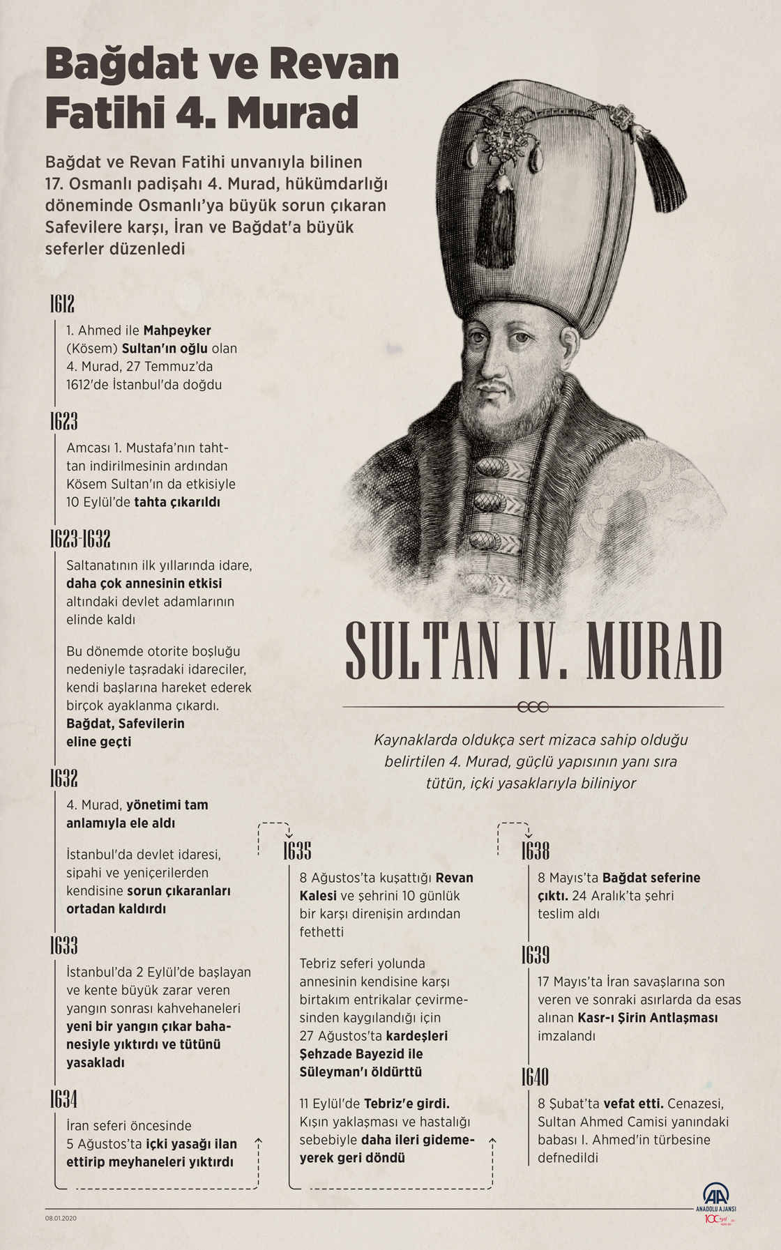 Bağdat ve Revan Fatihi unvanıyla bilinen 17. Osmanlı padişahı 4. Murad, hükümdarlığı döneminde Osmanlı’ya büyük sorun çıkaran Safevilere karşı, İran ve Bağdat'a büyük seferler düzenledi.