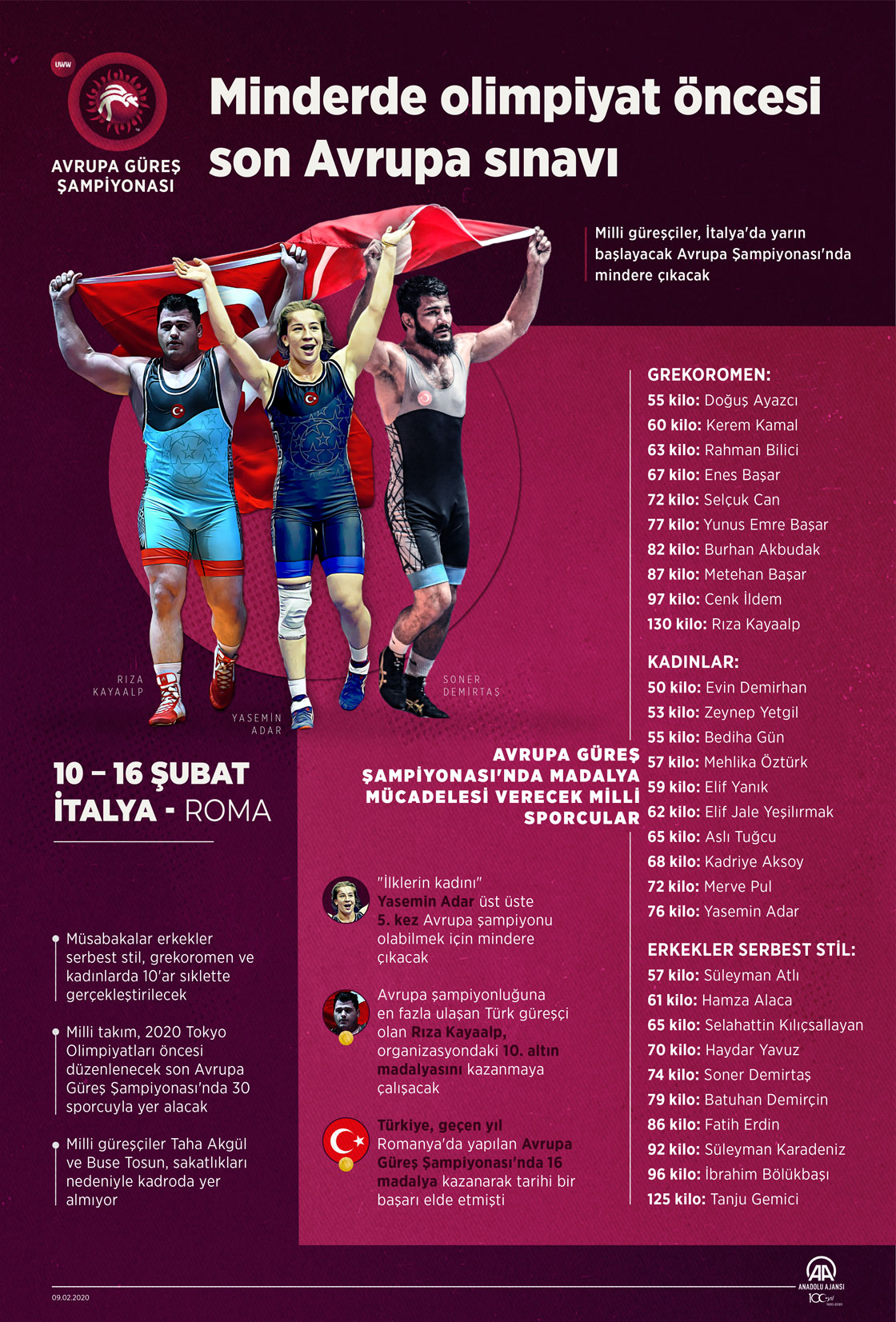 Milli güreşçiler, İtalya'da yarın başlayacak Avrupa Şampiyonası'nda mindere çıkacak. Başkent Roma'da düzenlenecek şampiyona 7 gün sürecek. Müsabakalar erkekler serbest stil, grekoromen ve kadınlarda 10'ar sıklette gerçekleştirilecek. Milli takım, 2020 Tokyo Olimpiyatları öncesi düzenlenecek son Avrupa Güreş Şampiyonası'nda 30 sporcuyla yer alacak. ( Yasin Demirci - Anadolu Ajansı )09 Şubat 2020•Güncelleme: 09 Şubat 2020
