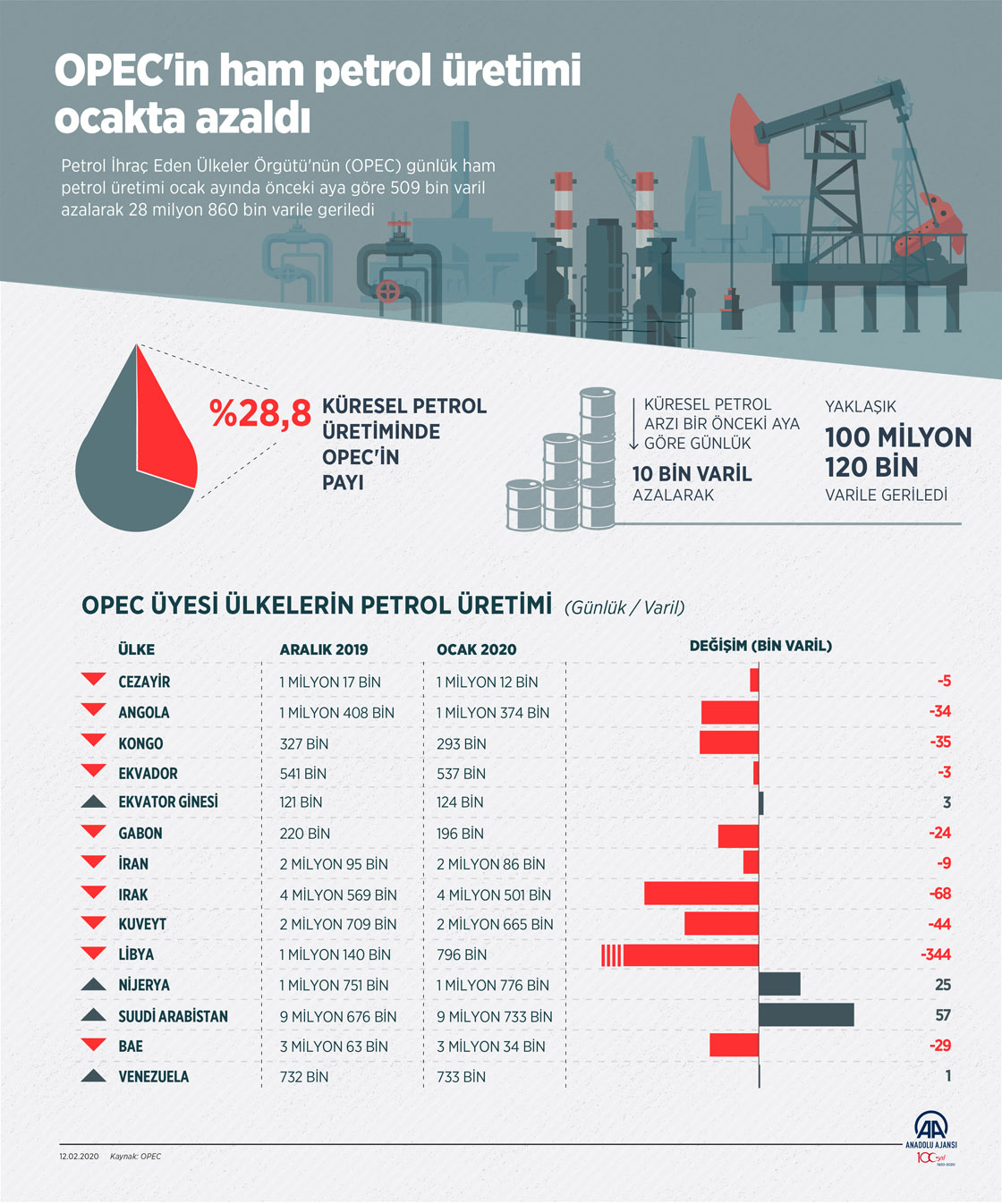 Petrol İhraç Eden Ülkeler Örgütü'nün (OPEC) günlük ham petrol üretimi ocak ayında önceki aya göre 509 bin varil azalarak 28 milyon 860 bin varile geriledi. OPEC'in 2020'nin Ocak ayına ilişkin petrol piyasası raporuna göre, geçen ay küresel petrol arzı bir önceki aya kıyasla günlük 10 bin varil azalarak yaklaşık 100 milyon 120 bin varile düştü. Geçen ay OPEC içinde günlük ham petrol üretimini en fazla artıran ülkeler sırasıyla Suudi Arabistan, Nijerya ve Ekvator Ginesi olarak belirlendi.