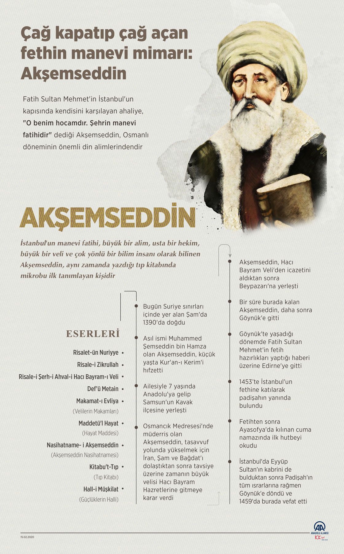 Osmanlı döneminin önemli din alimlerinden olan, Fatih Sultan Mehmet'in İstanbul'un kapısında kendisini karşılayan ahaliye, "O benim hocamdır. Şehrin manevi fatihidir" dediği Akşemseddin, vefatının 561. yılında anılıyor. (Anadolu Ajansı - Kemal Delikmen)15 Şubat 2020•Güncelleme: 15 Şubat 2020