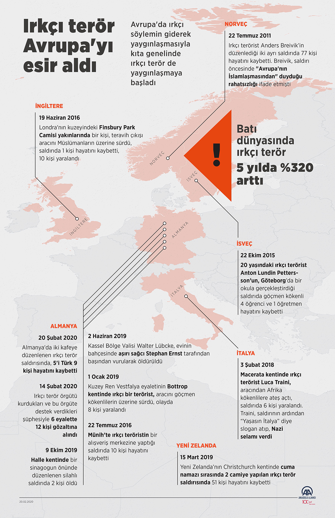 Almanya'da Müslümanları hedef alan ve 9 kişinin öldürüldüğü ırkçı terör saldırısı, kıtada giderek yaygınlaşan ırkçı terörün katliamlar yapacak kadar büyük bir tehdit haline dönüştüğünü gösterdi.