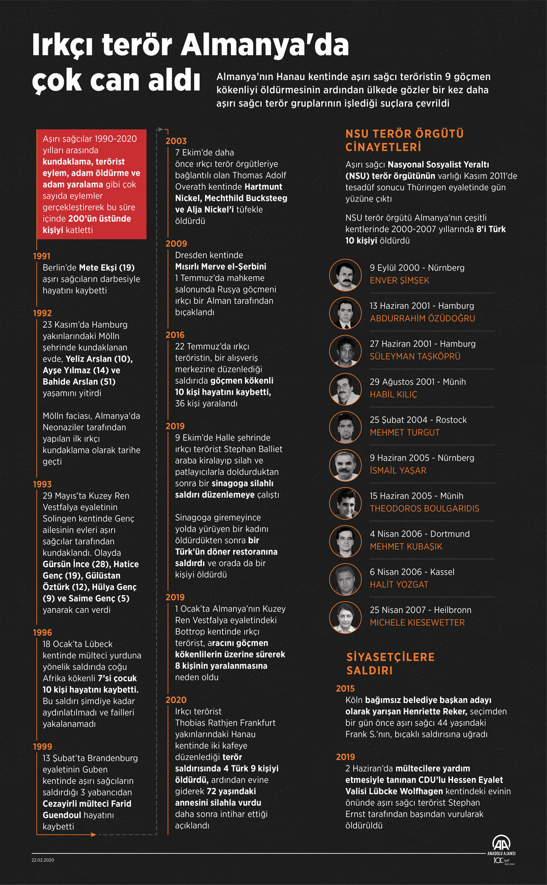 Almanya’nın Hanau kentinde ırkçı teröristin aralarında 4 Türk'ün de bulunduğu 9 göçmen kökenliyi öldürmesinin ardından ülkede gözler bir kez daha ırkçı grupların işlediği suçlara çevrildi. (Anadolu Ajansı - Yasin Demirci)