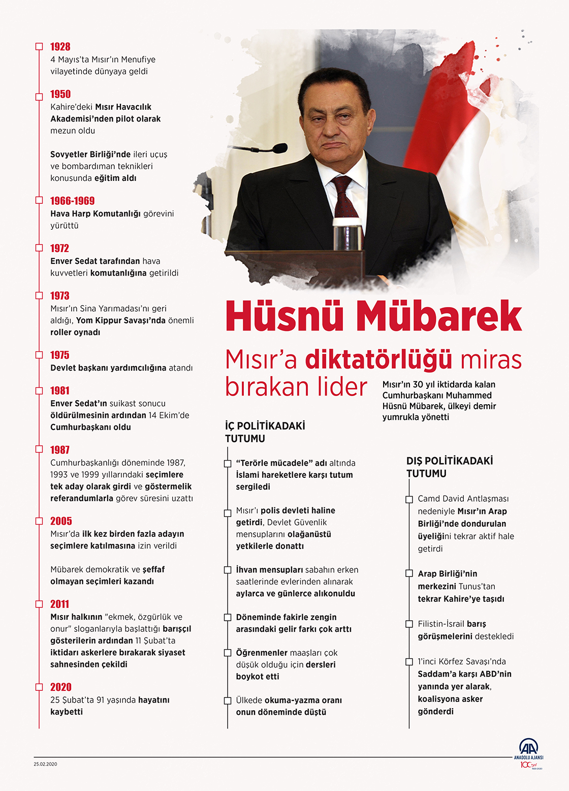 Mısır’ın 30 yıl iktidarda kalan Cumhurbaşkanı Muhammed Hüsnü Mübarek, ülkeyi demir yumrukla yönetti.