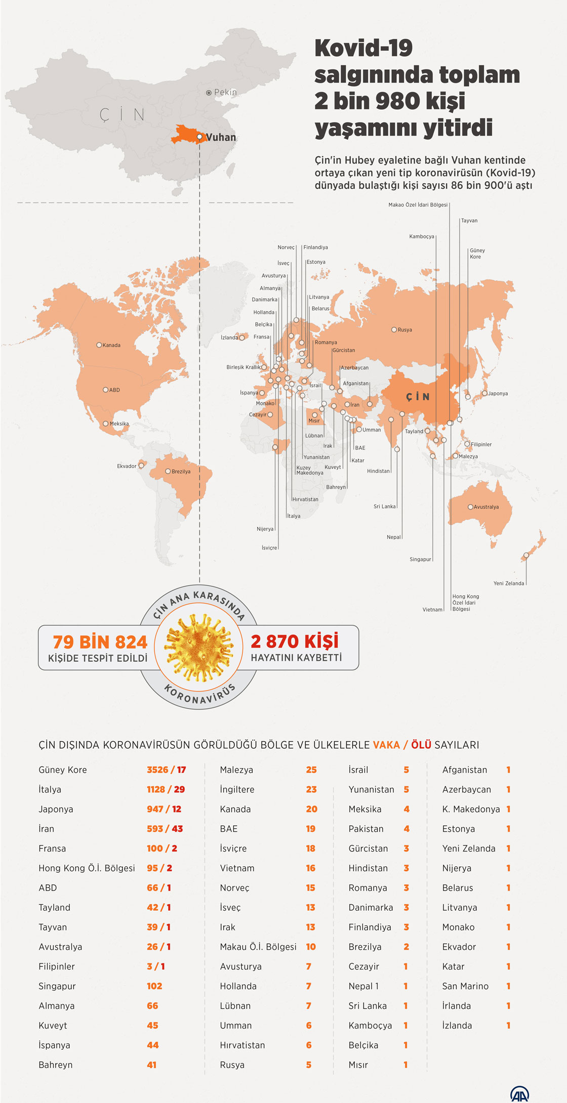 Çin ana karasında 2 bin 870, Hong Kong Özel İdari Bölgesi'nde 2, İran'da 43, İtalya'da 29, Güney Kore'de 17, Japonya'da 12, Fransa'da 2, Avustralya, ABD, Tayland, Tayvan ve Filipinler'de de 1'er kişi Kovid-19 nedeniyle hayatını kaybetti. ( Mahmut Resul Karaca - Anadolu Ajansı )01 Mart 2020•Güncelleme: 01 Mart 2020