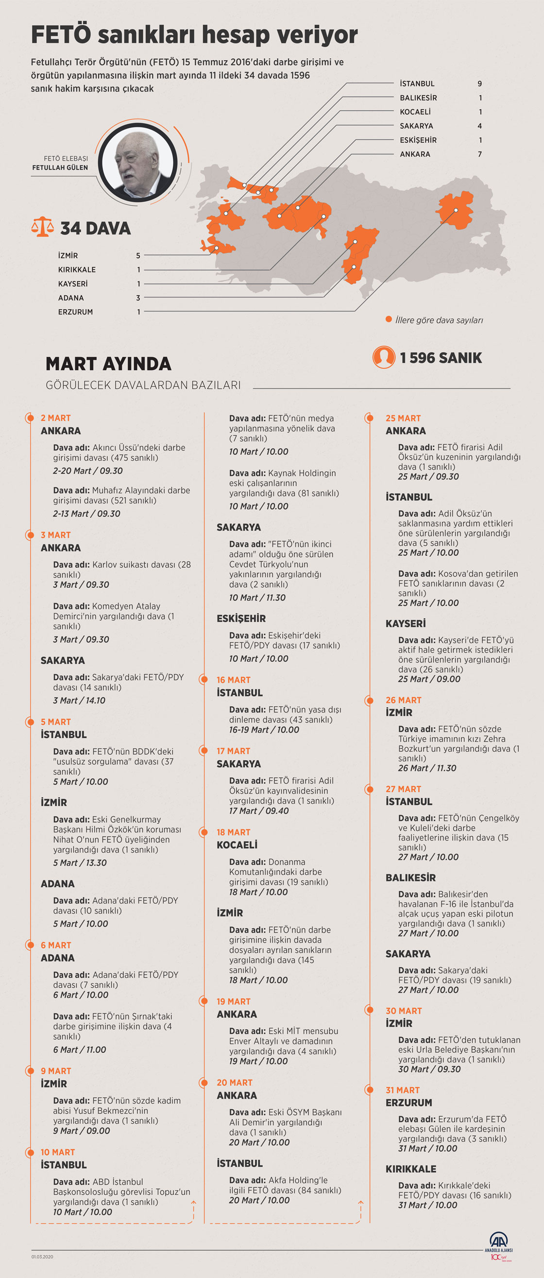 Fetullahçı Terör Örgütü'nün (FETÖ) 15 Temmuz 2016'daki darbe girişimi ve örgütün yapılanmasına ilişkin mart ayında 11 ildeki 34 davada 1596 sanık hakim karşısına çıkacak. ( Ahmet Burak Özkan - Anadolu Ajansı )