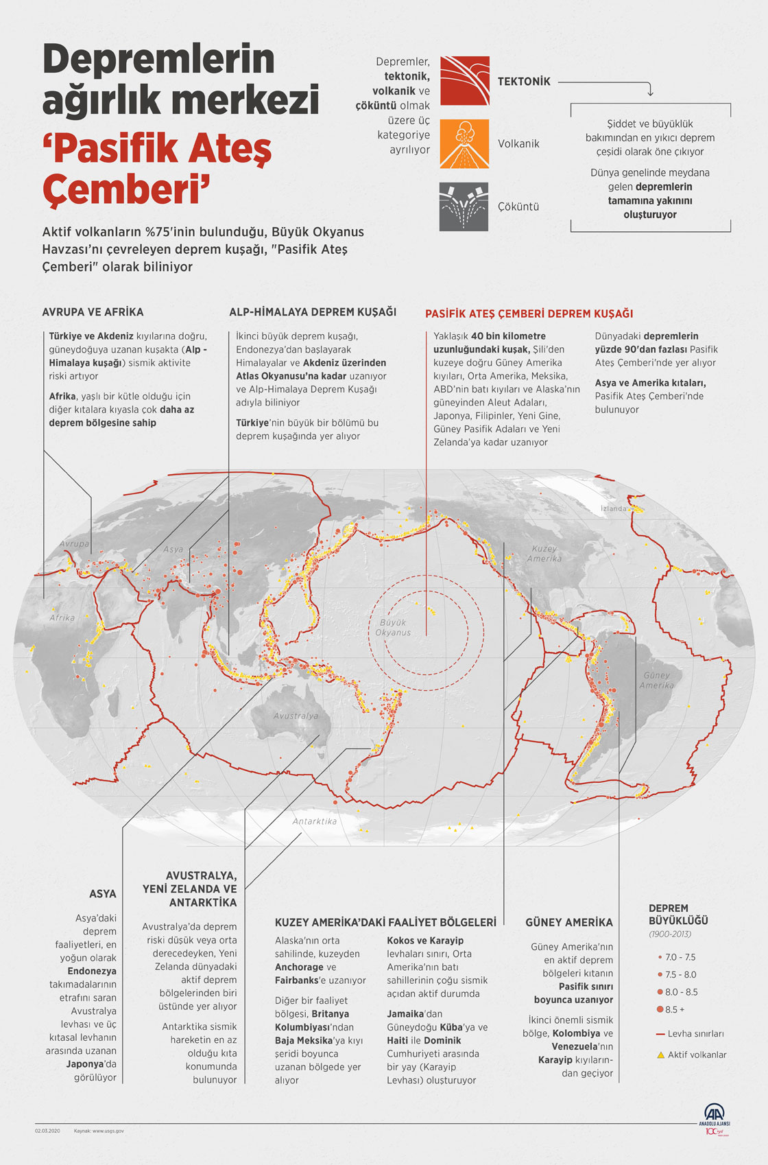 Dünyadaki tüm depremlerin yüzde 90'ı, büyük depremlerin ise yaklaşık yüzde 80'i "ateş çemberi" olarak adlandırılan Pasifik Deprem Kuşağında meydana geliyor. Tektonik depremler, deprem çeşitleri arasında dünya üzerinde gerçekleşen sarsıntıların tamamına yakınını oluşturuyor. ( Elmurod Usubaliev - Anadolu Ajansı )02 Mart 2020•Güncelleme: 02 Mart 2020