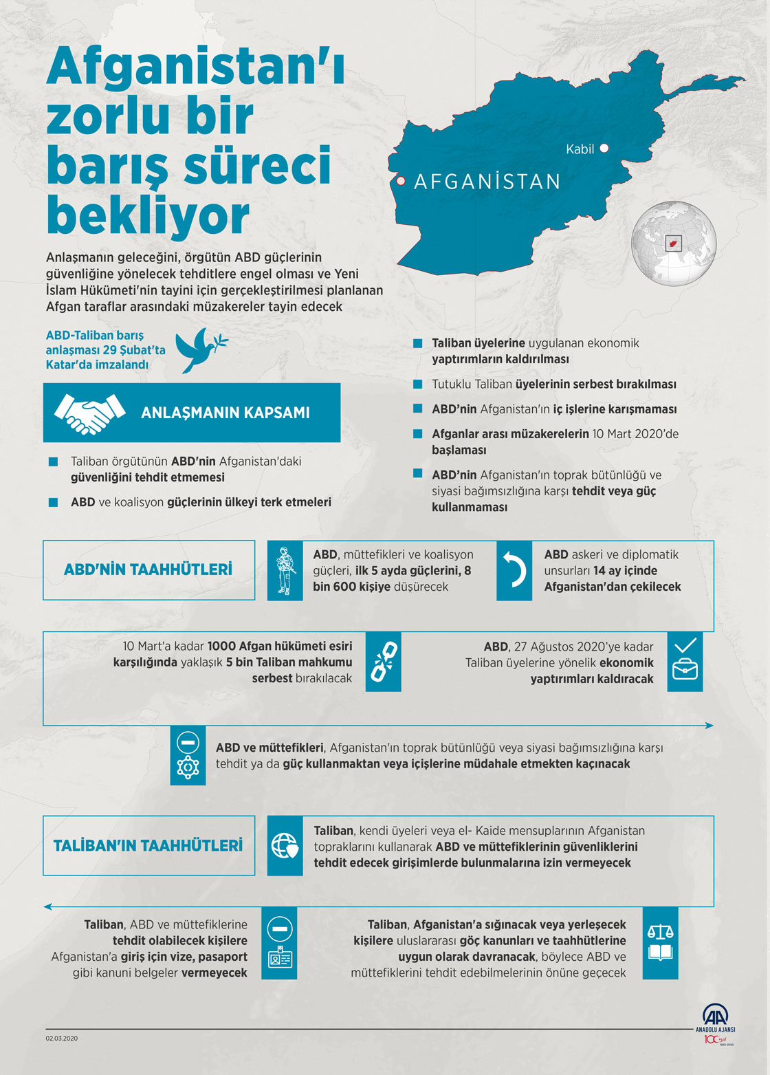 ABD güçlerinin ülkeyi terk etmesi, tutuklu Taliban üyelerinin salıverilmesi, yaptırımların kalkmasını taahhüt eden Taliban-ABD barış anlaşmasının geleceğini, örgütün ABD güçlerinin güvenliğine yönelecek tehditlere engel olması ve Yeni İslam Hükümeti'nin tayini için gerçekleştirilmesi planlanan Afgan taraflar arasındaki müzakereler tayin edecek. ( Mahmut Resul Karaca - Anadolu Ajansı )02 Mart 2020•Güncelleme: 02 Mart 2020