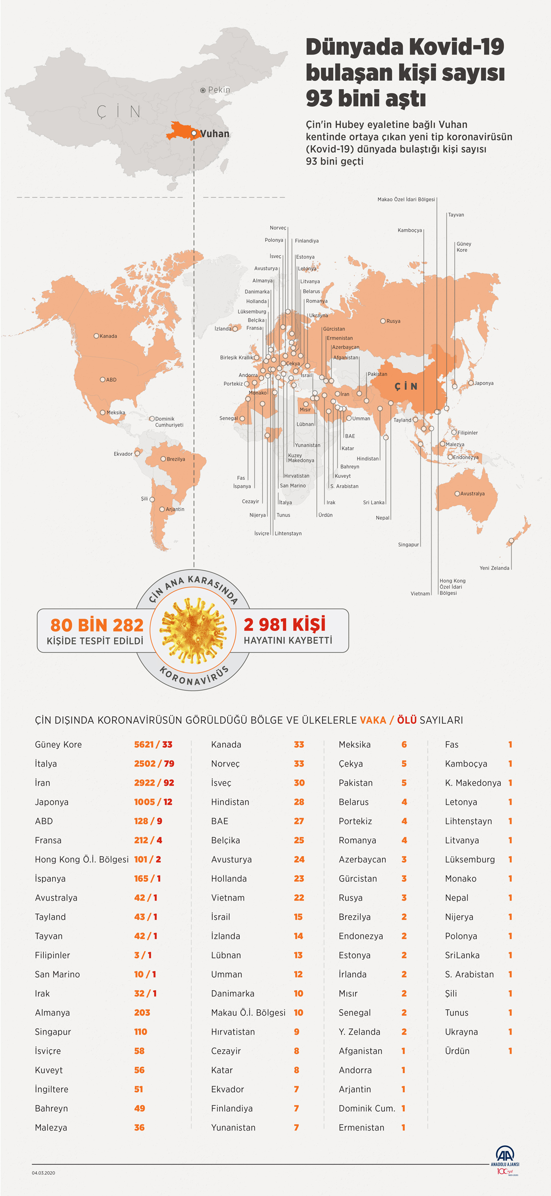 Çin'in Hubey eyaletine bağlı Vuhan kentinde ortaya çıkan yeni tip koronavirüsün (Kovid-19) dünya genelinde bulaştığı kişi sayısı 93 bini geçti. Kovid-19 salgınında toplam 3 bin 203 kişi hayatını kaybetti. Çin ana karasında yeni tip koronavirüs bulaşan kişi sayısı 80 bin 282, hayatını kaybeden kişi sayısı ise 2 bin 981 oldu. ( Ahmet Burak Özkan - Anadolu Ajansı )04 Mart 2020•Güncelleme: 04 Mart 2020
