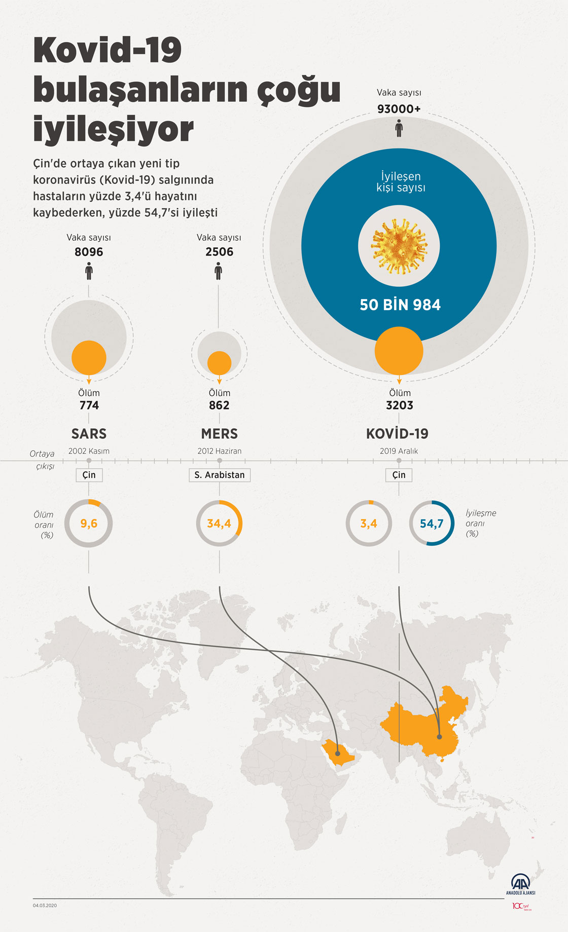 Çin'de ortaya çıkan yeni tip koronavirüs (Kovid-19) salgınında şu ana dek hastaların yüzde 3,4'ü hayatını kaybederken, yüzde 54,7'si iyileşti. ( Mahmut Resul Karaca - Anadolu Ajansı )
