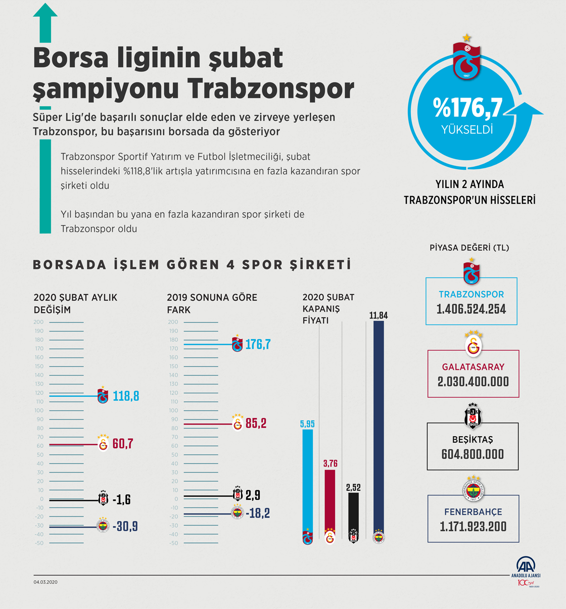 Borsa İstanbul'da işlem gören spor şirketlerinden Trabzonspor Sportif Yatırım ve Futbol İşletmeciliği, geçen ay hisselerindeki yüzde 118,8'lik artışla yatırımcısına en fazla kazandıran spor şirketi oldu. ( Muhammed Ali Yiğit - Anadolu Ajansı )