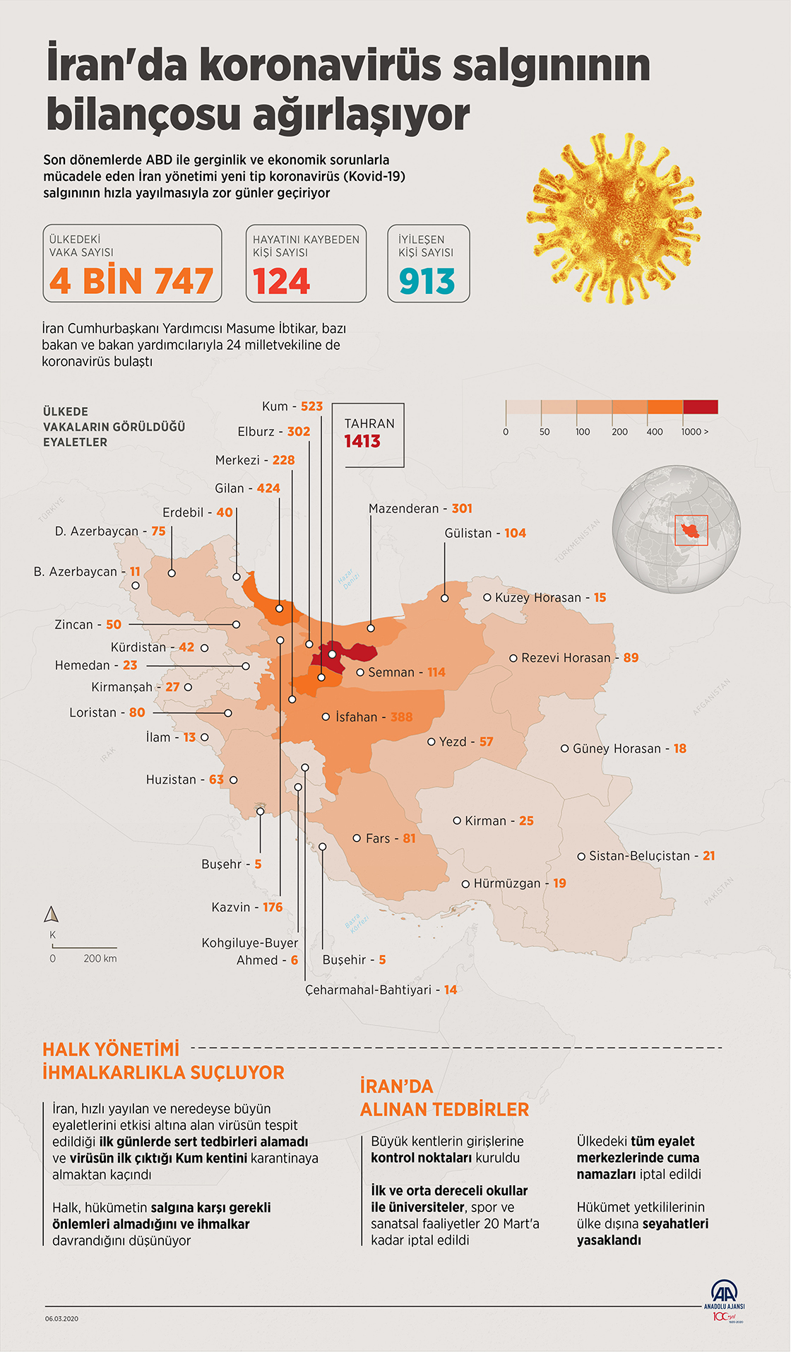 İran'ın neredeyse tamamına yayılan yeni tip koronavirüs, şu ana kadar 124 kişinin yaşamına mal olurken vaka sayısı da 4 bin 747'ye ulaştı. En çok vaka 1413 ile Tahran eyaletinde görüldü. Ülkede 913 kişi ise iyileşerek taburcu edildi.