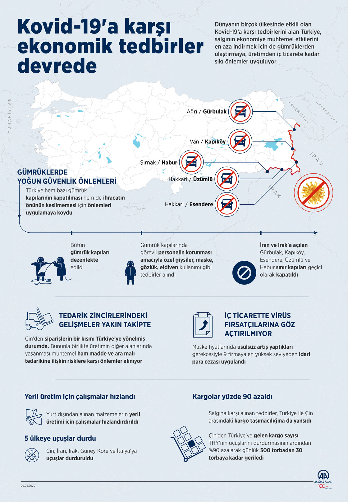 Dünyanın birçok ülkesinde etkili olan Kovid-19’a karşı tedbirlerini alan Türkiye, salgının ekonomiye muhtemel etkilerini en aza indirmek için de gümrüklerden ulaştırmaya, üretimden iç ticarete kadar sıkı önlemler uyguluyor ( Mahmut Resul Karaca - Anadolu Ajansı )09 Mart 2020•Güncelleme: 09 Mart 2020