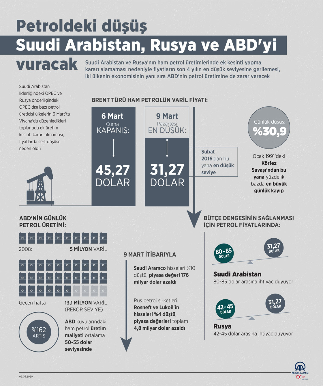Suudi Arabistan ve Rusya'nın ham petrol üretimlerinde ek kesinti yapma kararı alamaması nedeniyle fiyatların son 4 yılın en düşük seviyesine gerilemesi, iki ülkenin ekonomisinin yanı sıra ABD'nin petrol üretimine de zarar verecek. ( Mahmut Resul Karaca - Anadolu Ajansı )09 Mart 2020•Güncelleme: 09 Mart 2020