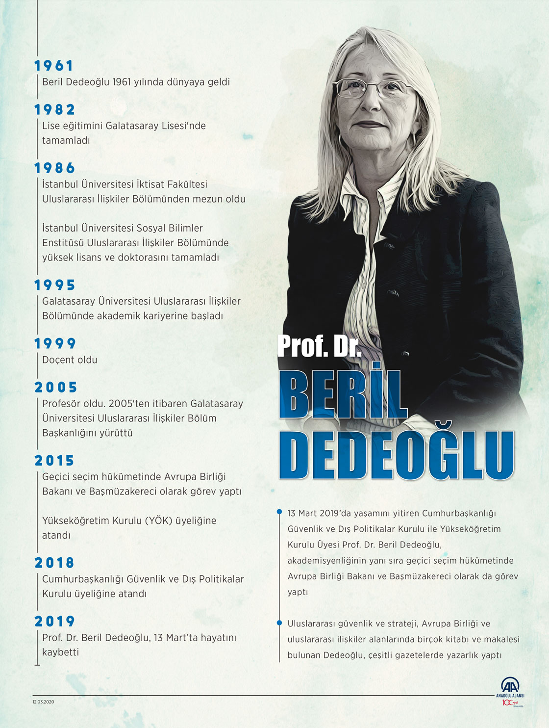 13 Mart 2019’da yaşamını yitiren Cumhurbaşkanlığı Güvenlik ve Dış Politikalar Kurulu ile Yükseköğretim Kurulu Üyesi Prof. Dr. Beril Dedeoğlu, akademisyenliğinin yanı sıra geçici seçim hükümetinde Avrupa Birliği Bakanı ve Başmüzakereci olarak da görev yaptı. ( Muhammed Ali Yiğit - Anadolu Ajansı )12 Mart 2020•Güncelleme: 12 Mart 2020