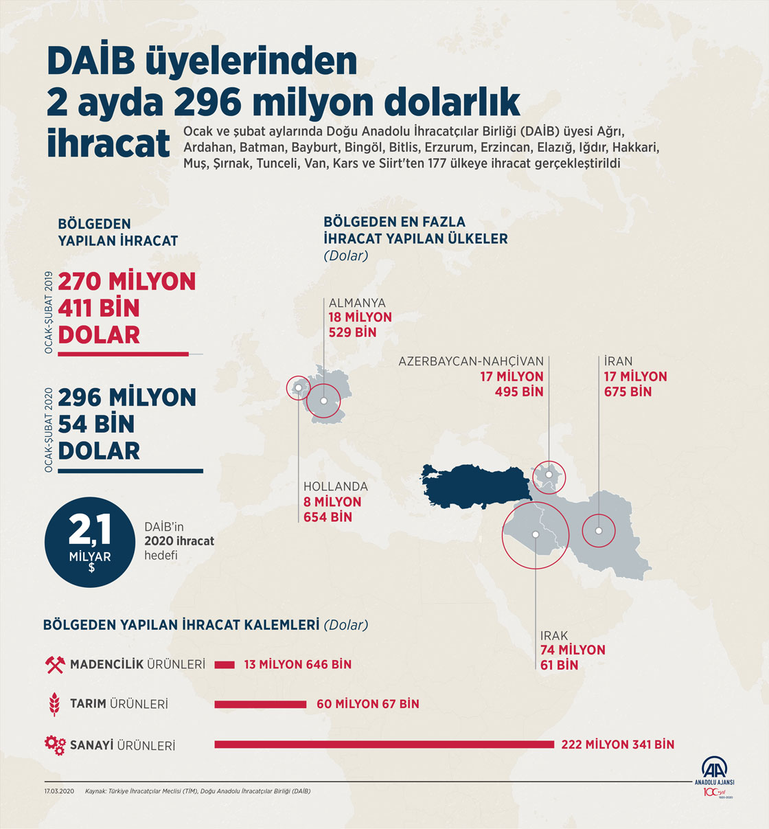 Doğu Anadolu İhracatçılar Birliği (DAİB) üyesi 17 ildeki firmalarca ocak ve şubat aylarında yapılan ihracat, geçen yılın aynı dönemine göre yüzde 9,48 artarak 296 milyon 54 bin dolar oldu. AA muhabirinin Türkiye İhracatçılar Meclisi (TİM) ve DAİB verilerinden yaptığı derlemeye göre, ocak ve şubat aylarında birliğin faaliyet bölgesindeki Ağrı, Ardahan, Batman, Bayburt, Bingöl, Bitlis, Erzurum, Erzincan, Elazığ, Iğdır, Hakkari, Muş, Şırnak, Tunceli, Van, Kars ve Siirt'ten 177 ülkeye ihracat gerçekleştirildi. ( Mahmut Resul Karaca - Anadolu Ajansı )17 Mart 2020•Güncelleme: 17 Mart 2020