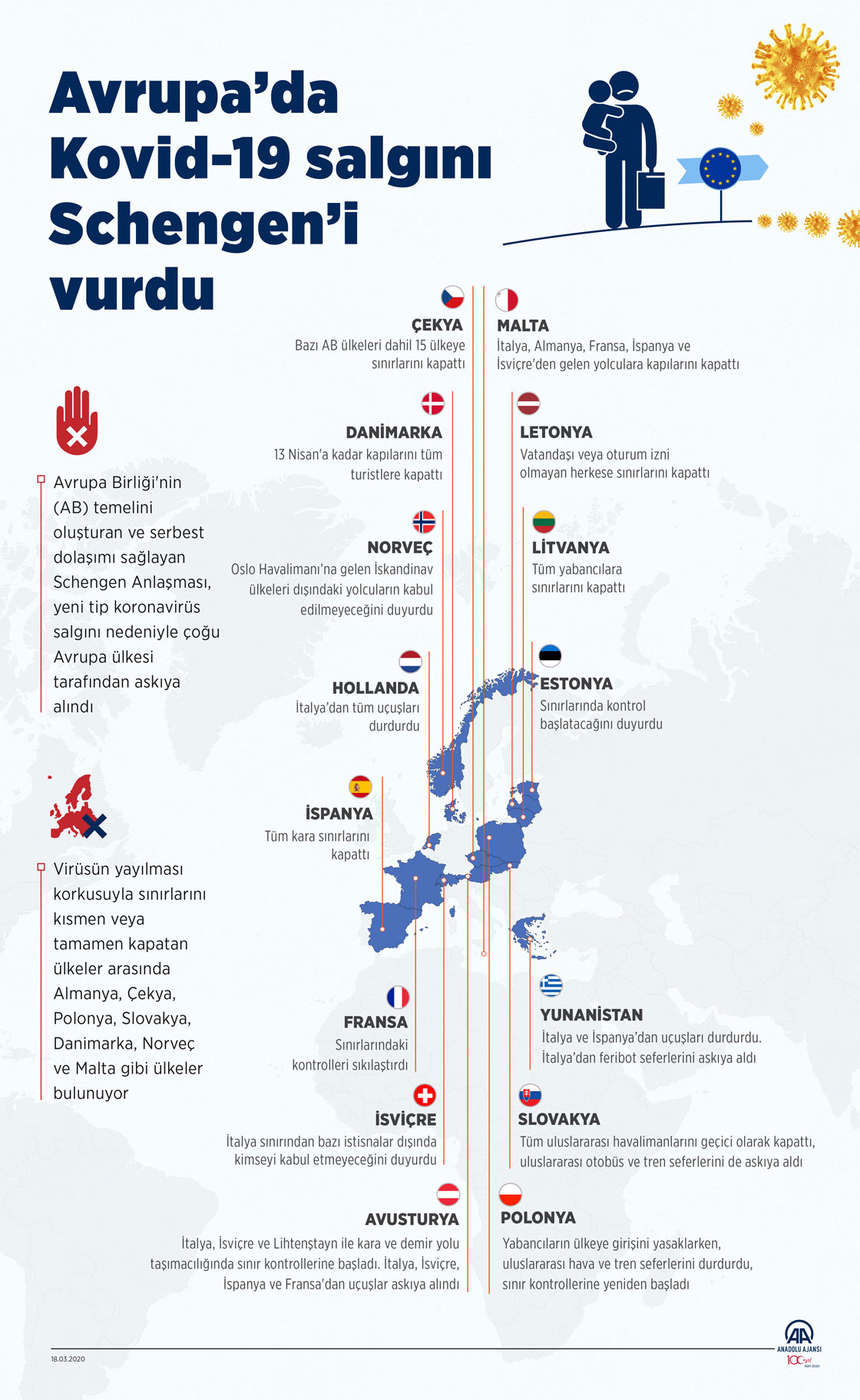 Avrupa’da hızla yayılan yeni tip koronavirüs (Kovid-19) salgını nedeniyle çoğu Avrupa ülkesinin sınırlarını kısmen veya tamamen kapatması, Avrupa Birliği'nin (AB) temelini oluşturan ve serbest dolaşımı sağlayan Schengen Anlaşması'nı tehdit ediyor.