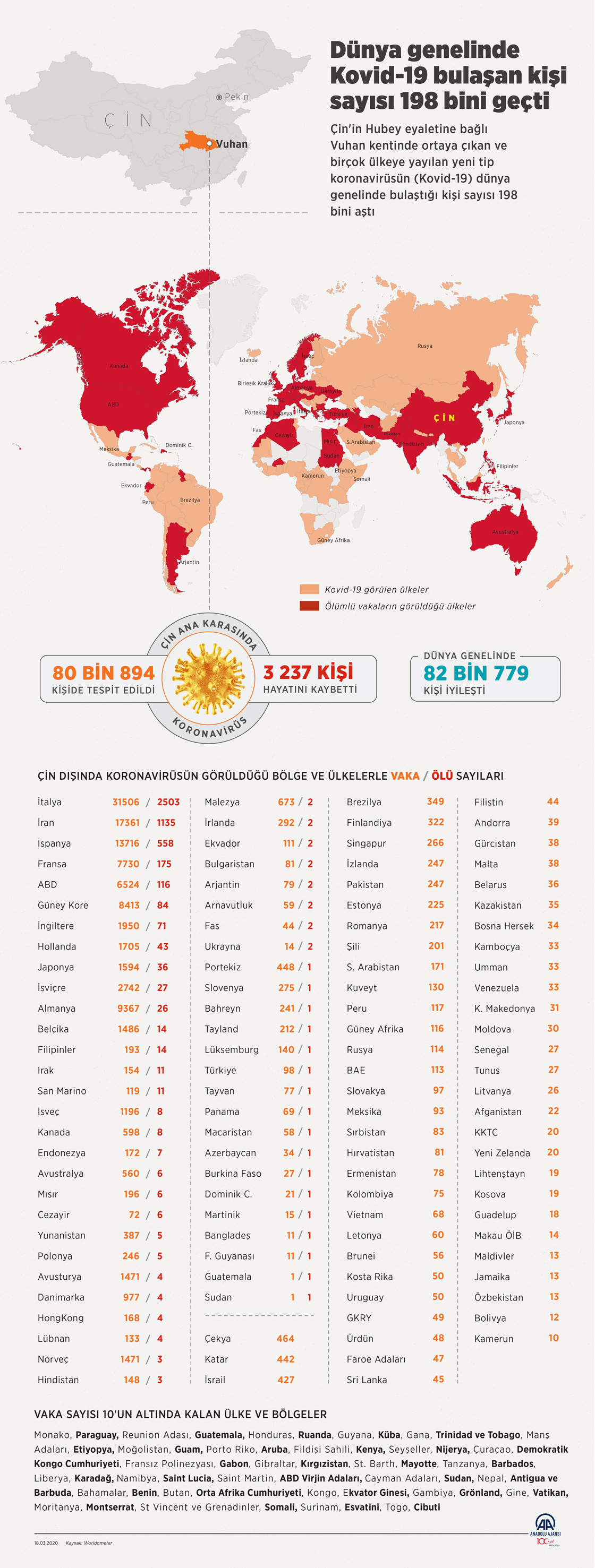 Çin'in Hubey eyaletine bağlı Vuhan kentinde ortaya çıkan ve birçok ülkeye yayılan yeni tip koronavirüsün (Kovid-19) dünya genelinde bulaştığı kişi sayısı 198 bini aştı. Grafik: Mehmet Resul Karaca/AA