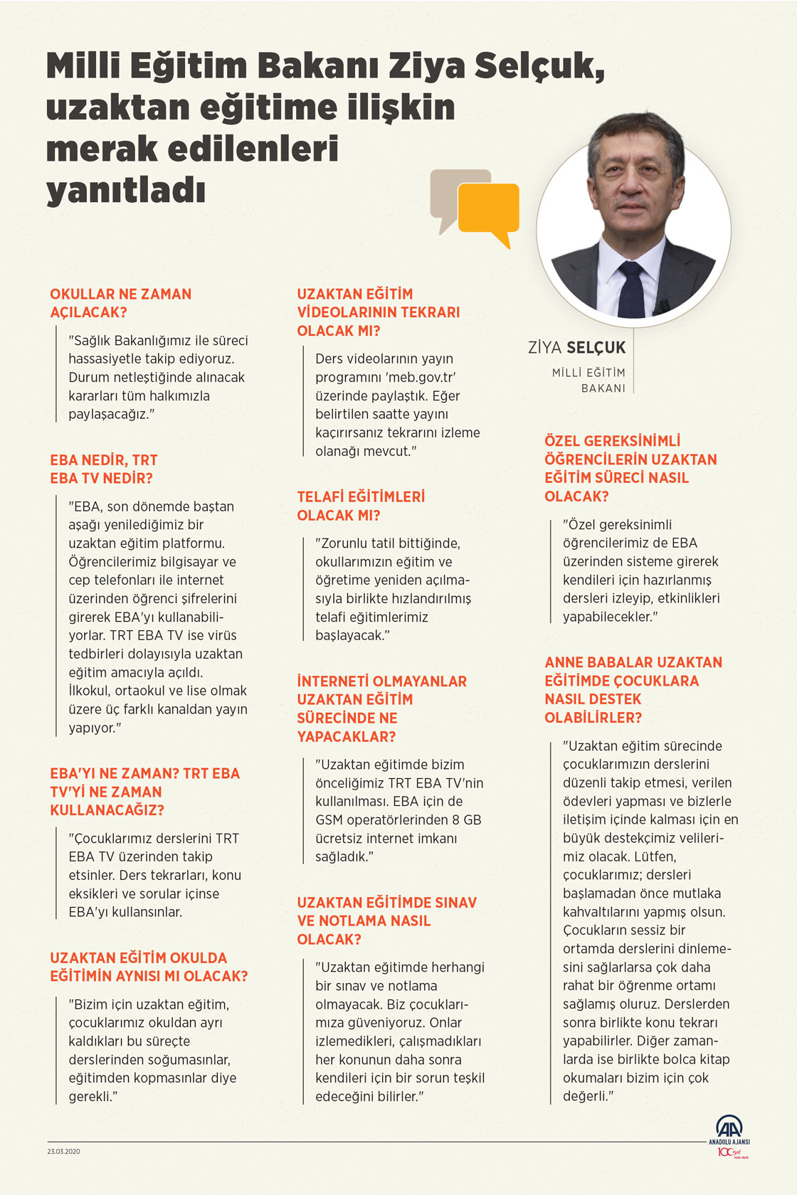 Milli Eğitim Bakanı Ziya Selçuk, sosyal medya hesapları ile Bakanlığın "meb.gov.tr" internet sitesi üzerinden yayınlanan "10 Soruda Uzaktan Eğitim" başlıklı videoyla uzaktan eğitim sürecine ilişkin merak edilenleri cevapladı. ( Elmurod Usubaliev - Anadolu Ajansı )23 Mart 2020•Güncelleme: 23 Mart 2020