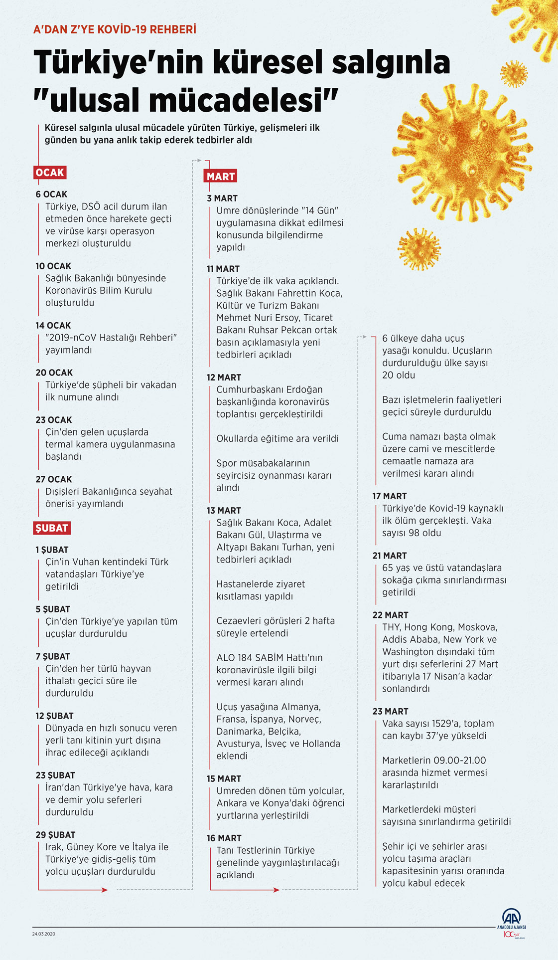 Çin'in Vuhan kentinde ortaya çıkan yeni tip koronavirüs (Kovid-19) dünya geneline yayılırken, her ülke virüsle mücadele yöntemlerini geliştirmeye devam ediyor. Koronavirüs ile mücadele kapsamında alınan tedbirler, bulaş yolları, belirtiler, tanı yöntemleri, aşı ve ilaç çalışmaları, doğru bilenen yanlışlar, maske kullanım esasları ve Türkiye'deki son durum ve hayata geçirilen uygulamalar, DSÖ ve Sağlık Bakanlığının uyarıları sonucu güncellendi. Buna göre, Kovid-19'a ilişkin merak edilenler ve Türkiye'de yapılan çalışmalar şöyle. ( GRAFİK: EKİP - Anadolu Ajansı )24 Mart 2020•Güncelleme: 24 Mart 2020