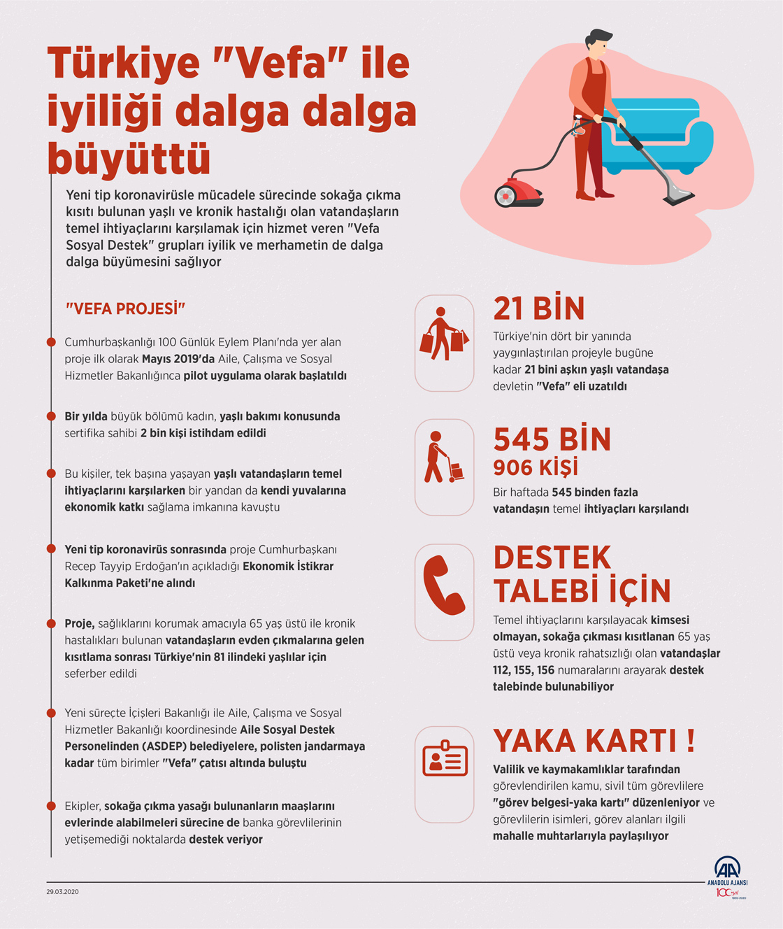 Yeni tip koronavirüsle mücadele sürecinde sokağa çıkma kısıtı bulunan yaşlı ve kronik hastalığı olan vatandaşların temel ihtiyaçlarını karşılamak için hizmet veren "Vefa Sosyal Destek" grupları iyilik ve merhametin de dalga dalga büyümesini sağlıyor. ( Mahmut Resul Karaca - Anadolu Ajansı )29 Mart 2020•Güncelleme: 29 Mart 2020