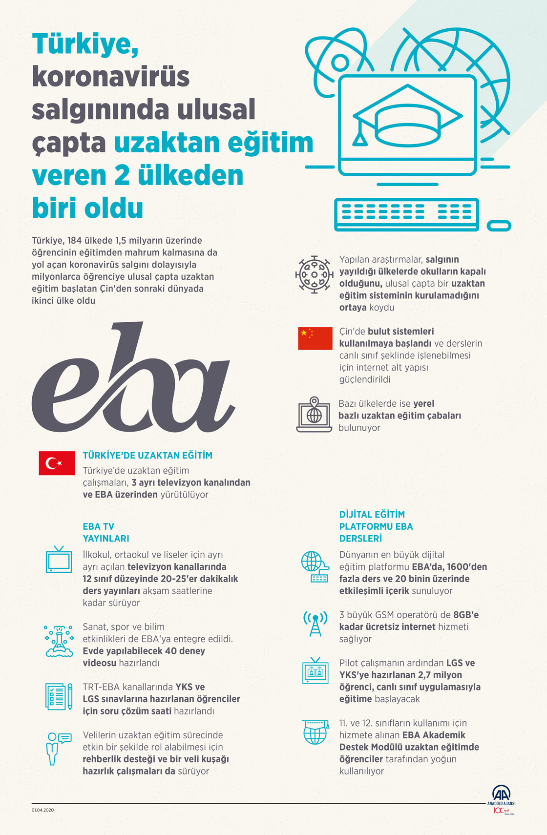 Türkiye, 184 ülkede 1,5 milyarın üzerinde öğrencinin eğitimden mahrum kalmasına da yol açan koronavirüs salgını dolayısıyla milyonlarca öğrenciye ulusal çapta uzaktan eğitim başlatan Çin'den sonraki dünyada ikinci ülke oldu. ( Yasin Demirci - Anadolu Ajansı )01 Nisan 2020•Güncelleme: 01 Nisan 2020