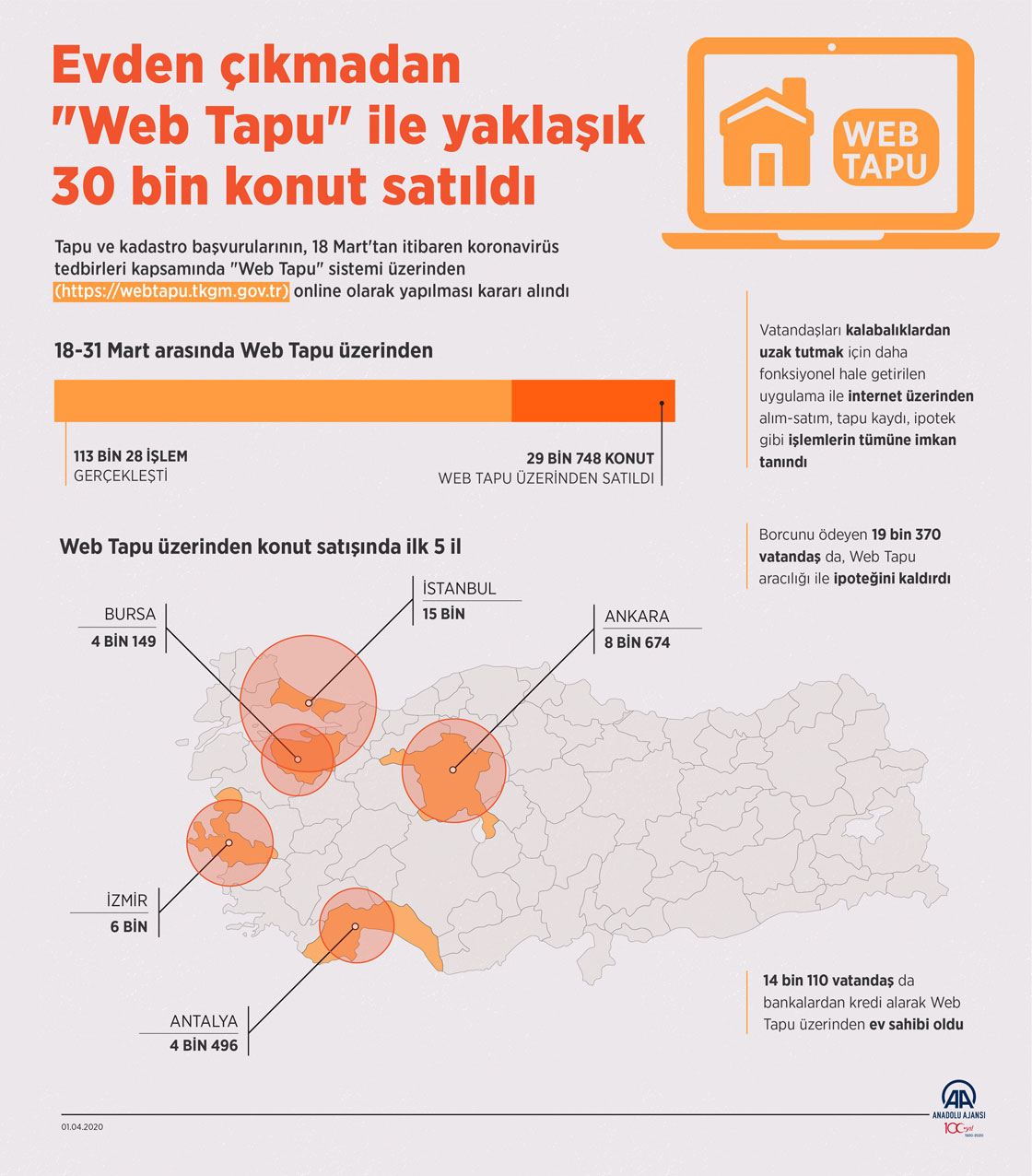 Çevre ve Şehircilik Bakanlığına bağlı Tapu ve Kadastro Genel Müdürlüğünce yeni tip koronavirüs (Kovid-19) tedbirleri kapsamında, 18 Mart itibarıyla tapu işlemlerinin Web Tapu üzerinden de yapılmaya başlanmasıyla vatandaşlar, evlerinden çıkmadan bugüne kadar 113 bin 28 işlem yaptı. Bu süre içinde 29 bin 748 konut, online olarak satıldı. ( Mahmut Resul Karaca - Anadolu Ajansı )01 Nisan 2020•Güncelleme: 01 Nisan 2020
