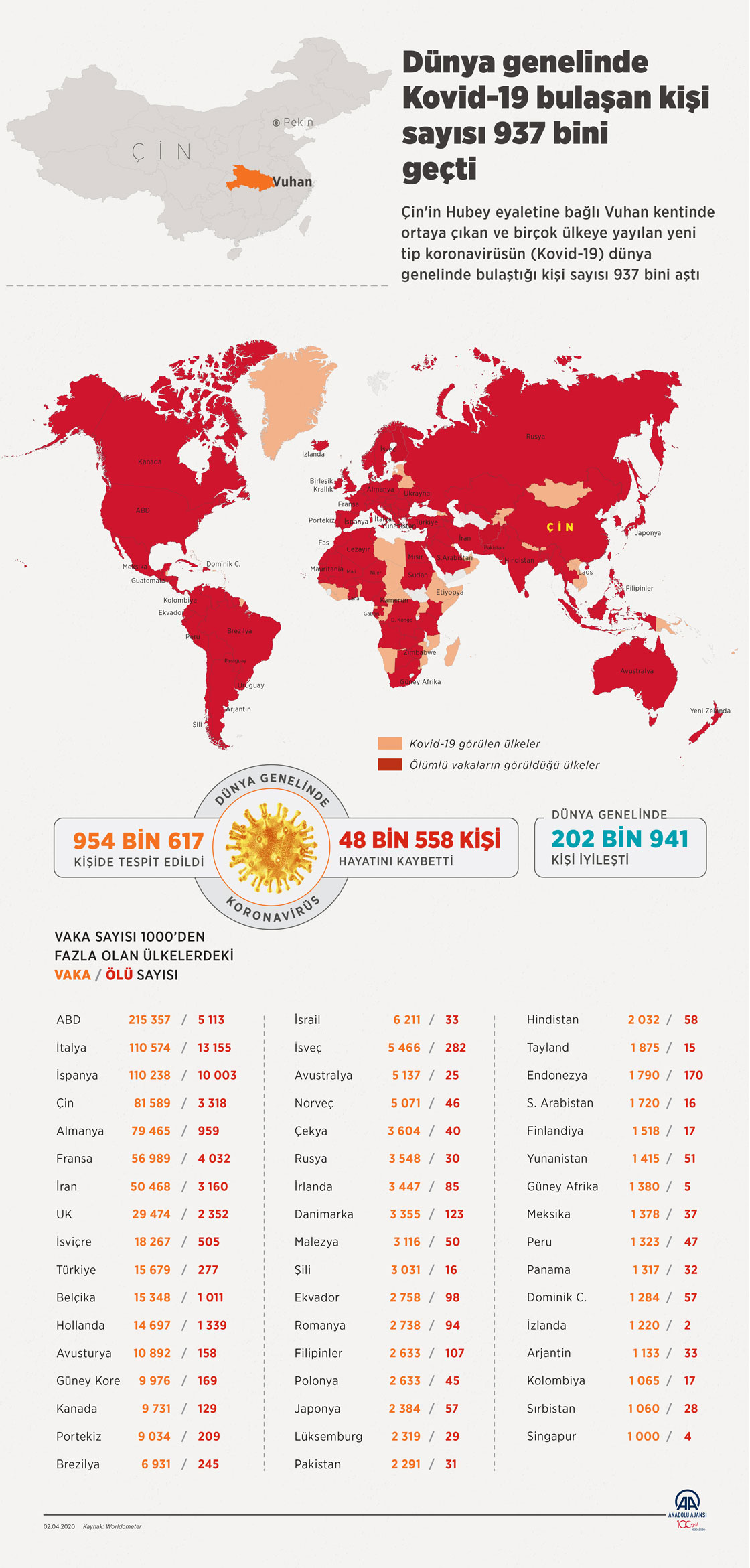 Çin'in Hubey eyaletine bağlı Vuhan kentinde ortaya çıkan ve birçok ülkeye yayılan yeni tip koronavirüsün (Kovid-19) dünya genelinde bulaştığı kişi sayısı 937 bini aştı. ( Mahmut Resul Karaca - Anadolu Ajansı )