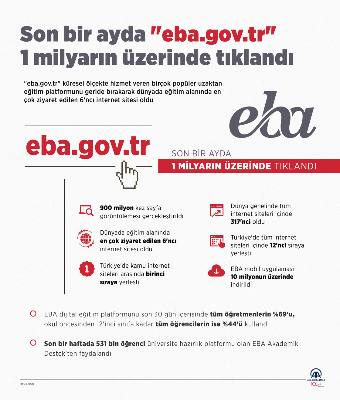 Milli Eğitim Bakanlığının (MEB) dijital eğitim platformu "eba.gov.tr", son bir ayda 1 milyarın üzerinde tıklanarak küresel ölçekte hizmet veren birçok popüler uzaktan eğitim platformunu geride bıraktı. (Grafik: Kemal Delikmen/AA)