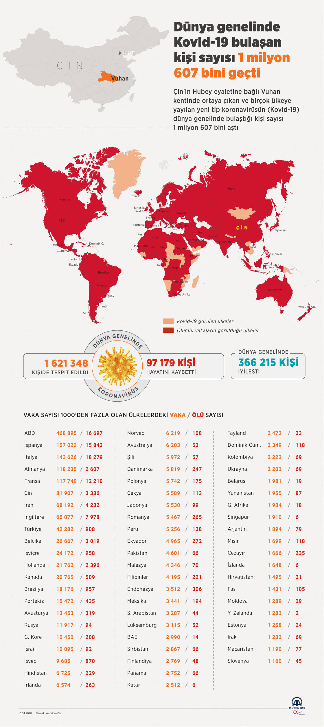 Çin'in Hubey eyaletine bağlı Vuhan kentinde ortaya çıkan yeni tip koronavirüsün (Kovid-19) dünya genelinde bulaştığı kişi sayısı 1 milyon 607 bini aştı.(Ahmet Burak Özkan/AA)