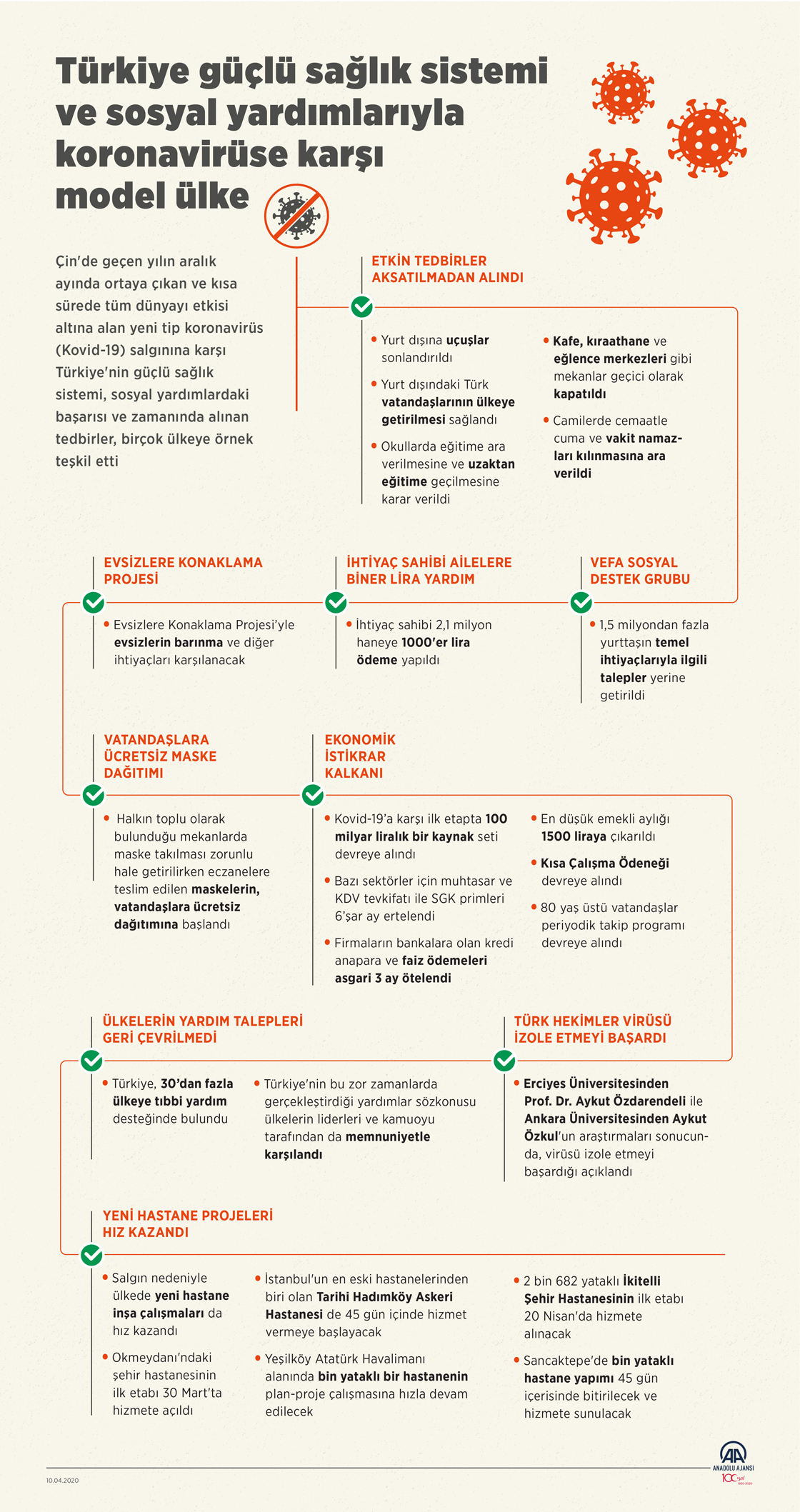 Türkiye'nin, Çin'in Vuhan kentinde Aralık 2019'da ortaya çıkan ve daha sonra Dünya Sağlık Örgütü tarafından "pandemi" olarak ilan edilen yeni tip koronavirüs (Kovid-19) salgınının yayılmasını engellemek için aldığı sıkı tedbirlerin yanı sıra sağlık alanındaki başarısı, sosyal yardımlar ve ücretsiz maske dağıtımı gibi uygulamaları birçok ülkeye örnek oluyor.11 Nisan 2020•Güncelleme: 11 Nisan 2020
