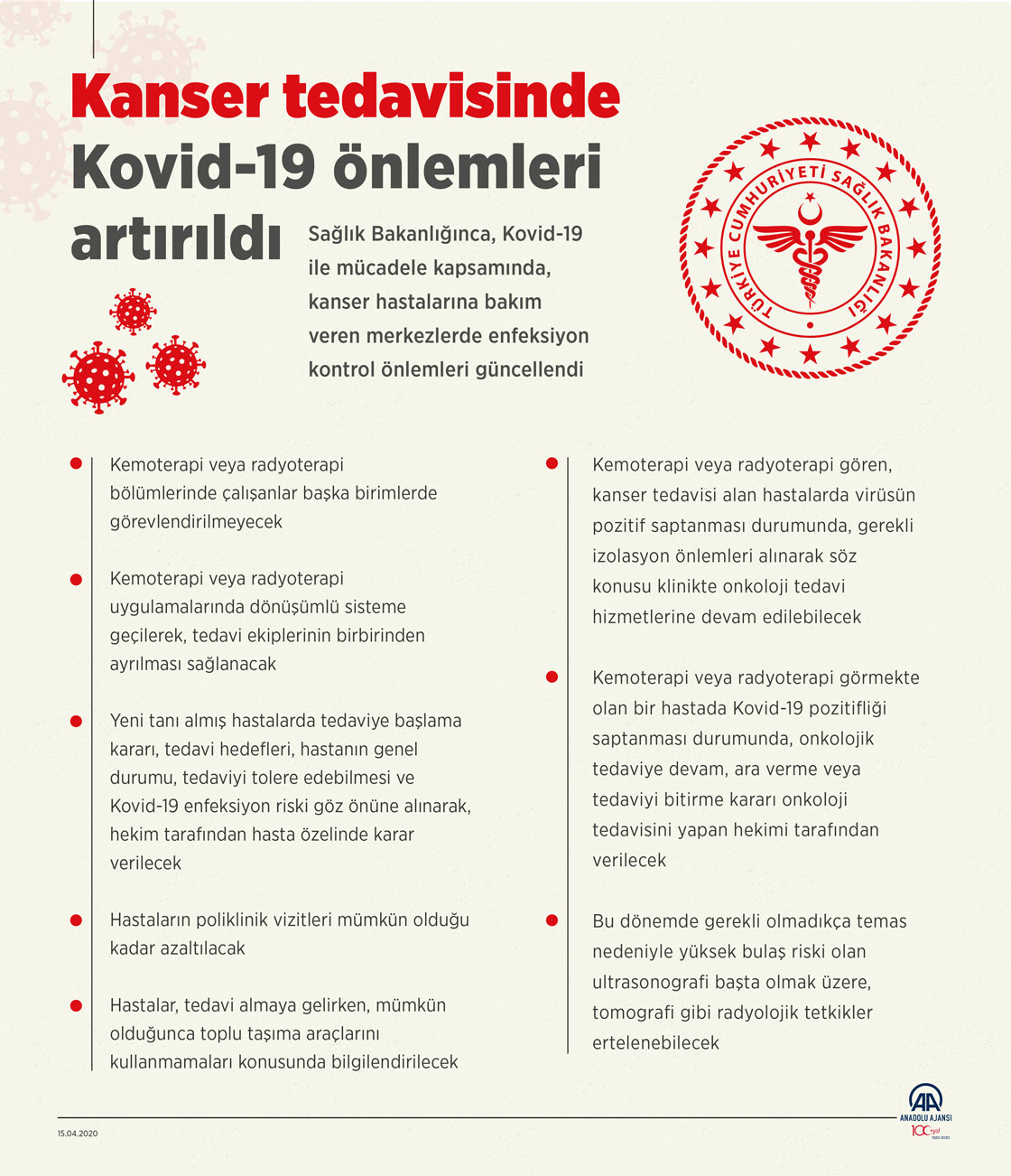 Sağlık Bakanlığınca Kovid-19'a yönelik alınan tedbirler kapsamında, kanser hastalarının takip ve tedavileri yeniden planlanacak, yeni tanı konulan hastalarda tedaviye başlama kararı hekim tarafından hasta özelinde karar verilecek. ( Muhammed Ali Yiğit - Anadolu Ajansı )15 Nisan 2020•Güncelleme: 15 Nisan 2020