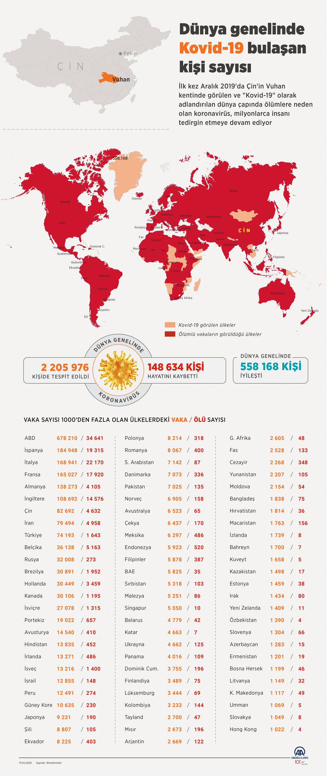 Çin'in Hubey eyaletine bağlı Vuhan kentinde ortaya çıkan yeni tip koronavirüsün (Kovid-19) dünya genelinde bulaştığı kişi sayısı 2 milyon 200 bini aştı. (Grafik:Ahmet Burak Özkan/AA)