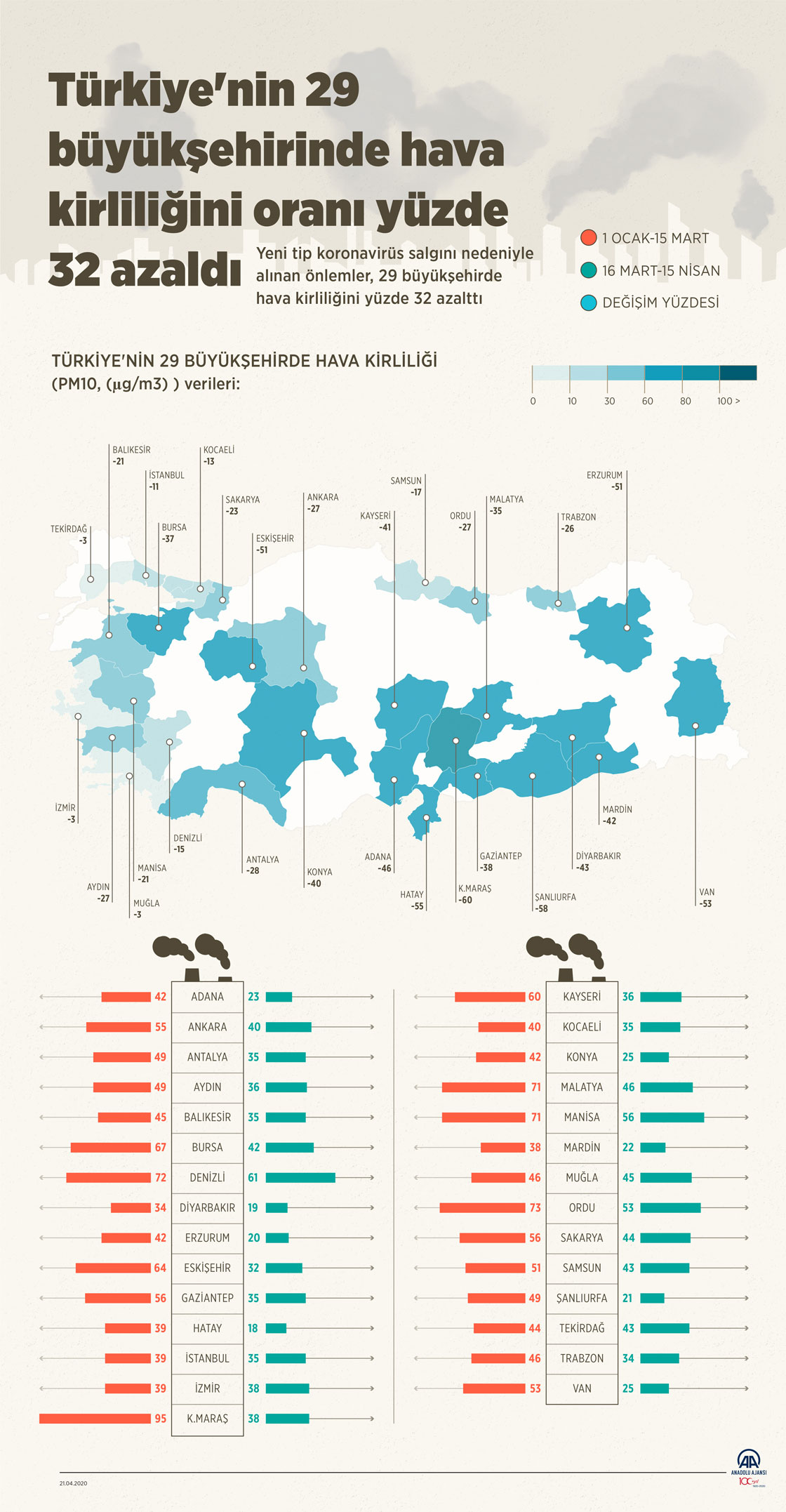 Yeni tip koronavirüs salgını nedeniyle alınan önlemler, 29 büyükşehirde hava kirliliğini yüzde 32 azalttı. Vatandaşların koronavirüs salgını tedbirleri kapsamında evde kalması, araç kullanımını büyük oranda düşürdü. İnsanların evde kalması havanın kalitesini iyileştirirken, kirliliğin azalmasını sağladı. ( Muhammed Ali Yiğit - Anadolu Ajansı )21 Nisan 2020•Güncelleme: 21 Nisan 2020