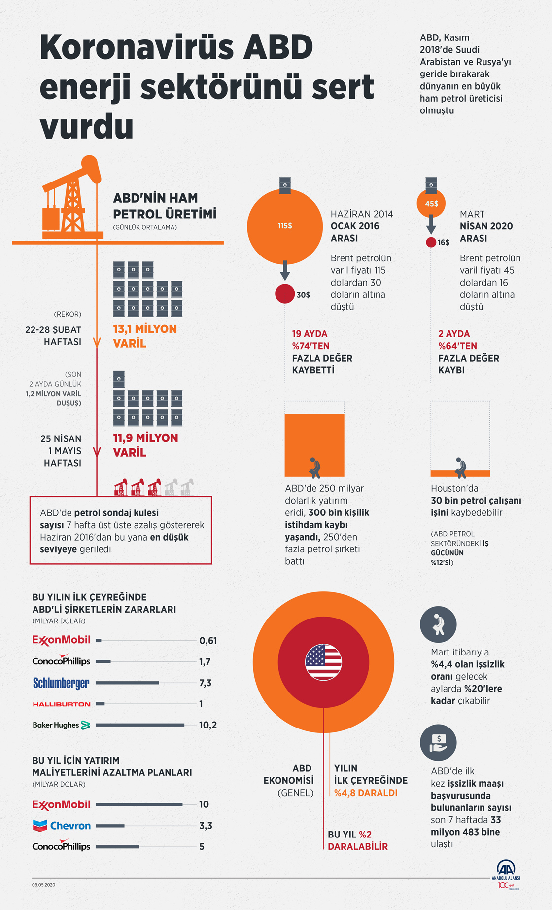 Çin'de ortaya çıkarak hızla dünyaya yayılan yeni tip koronavirüs (Kovid-19) salgını, ABD enerji sektöründe milyarlarca dolar zarara ve petrol üretiminde sert düşüşlere neden oldu. ( Yasin Demirci - Anadolu Ajansı )