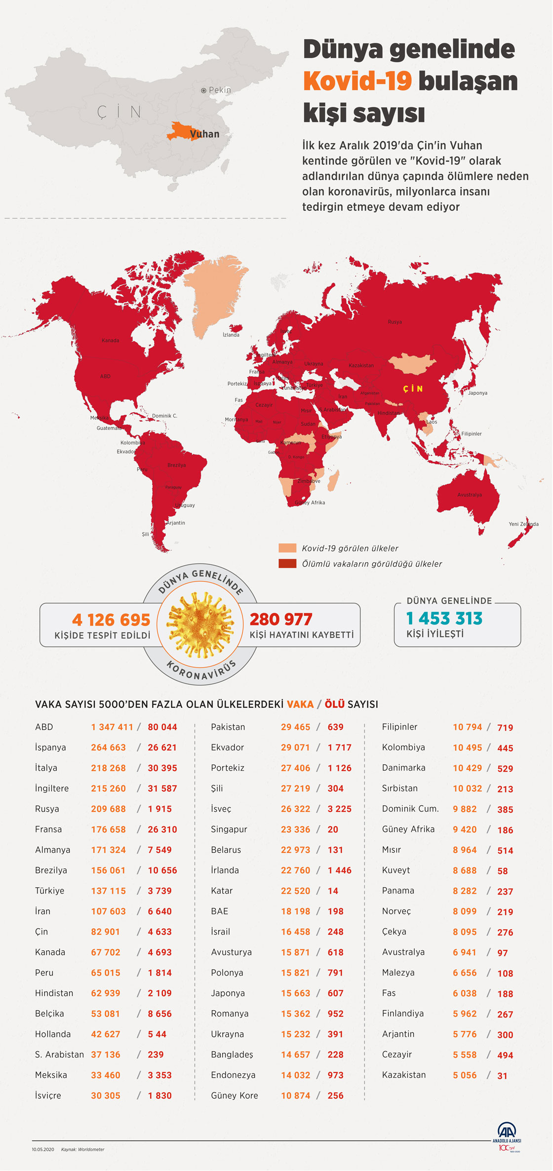 Çin'in Hubey eyaletine bağlı Vuhan kentinde ortaya çıkan yeni tip koronavirüsün (Kovid-19) dünya genelinde bulaştığı kişi sayısı 4 milyon 103 bini aştı. ( Mahmut Resul Karaca - Anadolu Ajansı )
