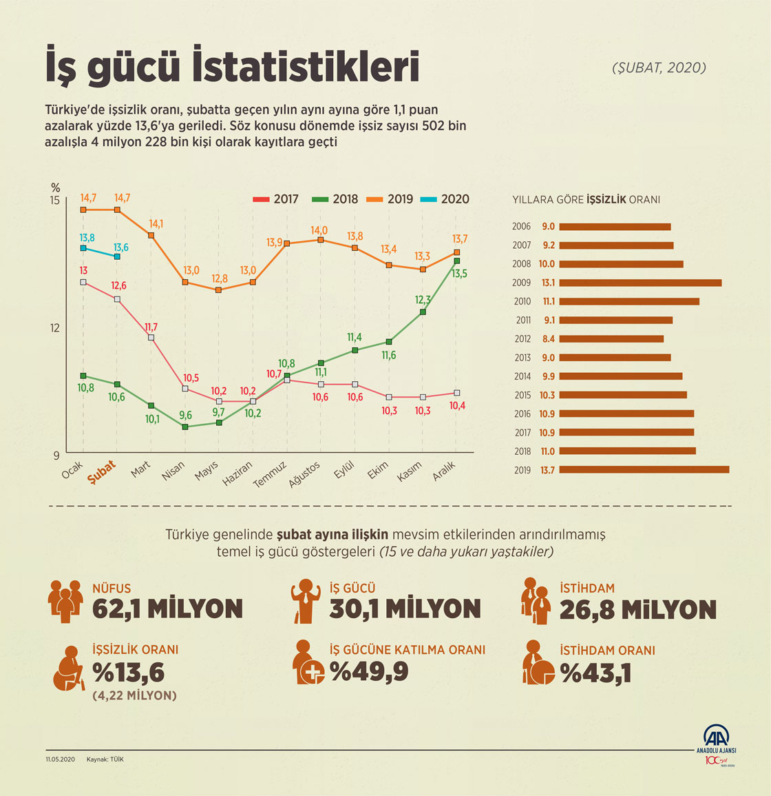 Türkiye İstatistik Kurumu (TÜİK), şubat ayına ilişkin iş gücü istatistiklerini açıkladı. Türkiye'de işsizlik oranı, şubatta geçen yılın aynı ayına göre 1,1 puan azalarak yüzde 13,6'ya geriledi. Söz konusu dönemde işsiz sayısı 502 bin azalışla 4 milyon 228 bin kişi olarak kayıtlara geçti. ( Muhammed Ali Yiğit - Anadolu Ajansı )11 Mayıs 2020•Güncelleme: 11 Mayıs 2020