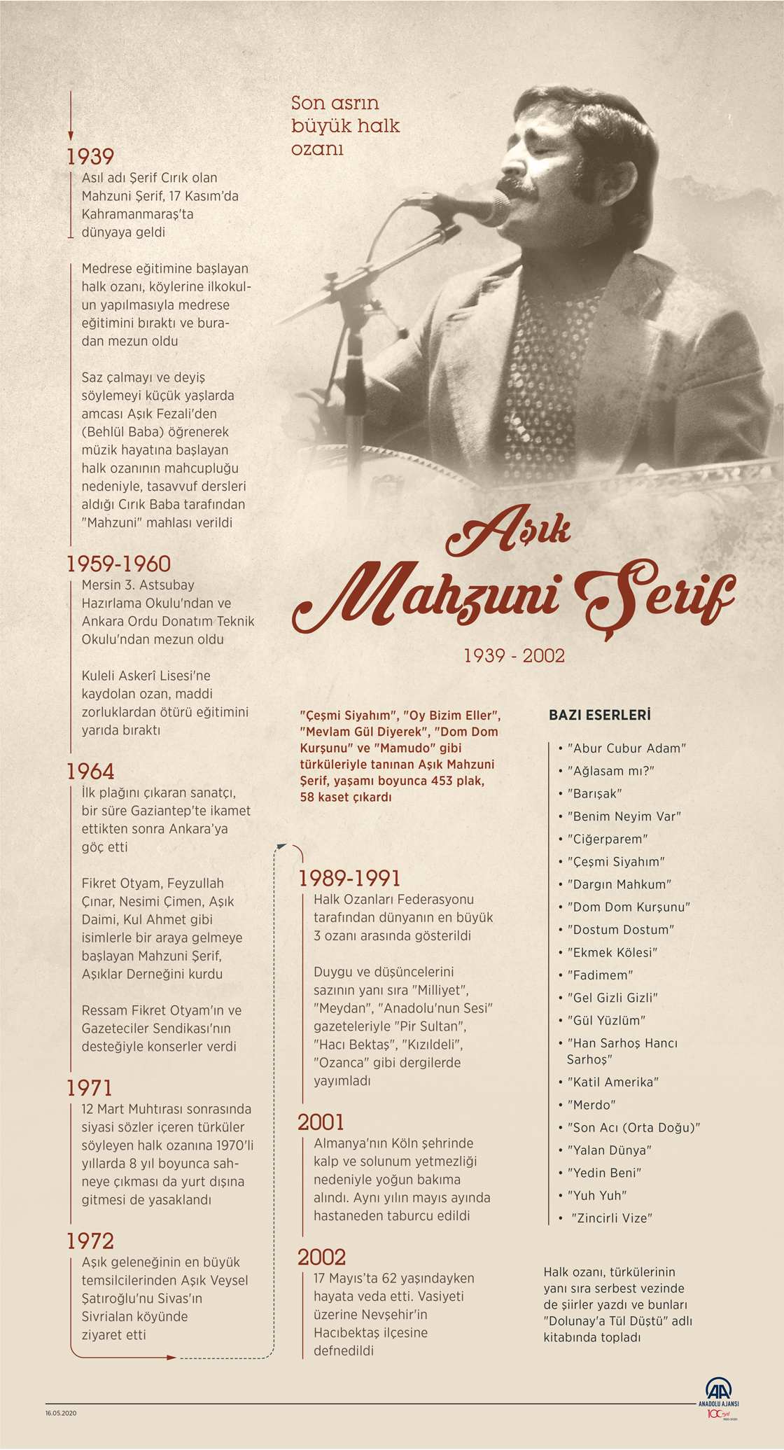 "Çeşmi Siyahım", "Oy Bizim Eller", "Mevlam Gül Diyerek", "Dom Dom Kurşunu" ve "Mamudo" gibi türküleriyle tanınan Aşık Mahzuni Şerif, ölümünün 18'inci yılında anılıyor. (Ahmet Burak Özkan - AA)