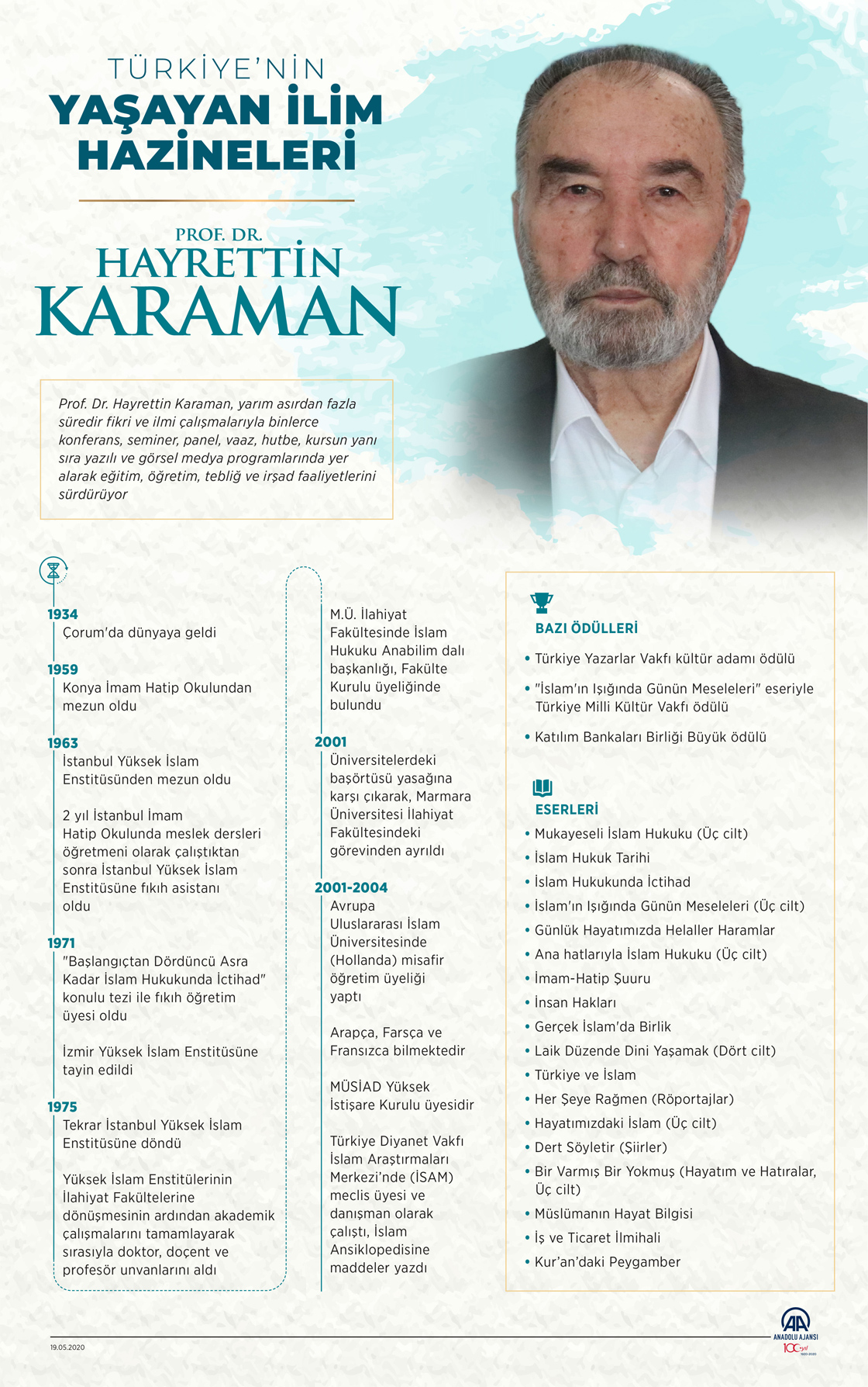 Marmara Üniversitesi İlahiyat Fakültesi emekli öğretim üyesi Prof. Dr. Hayrettin Karaman, yarım asırdan fazla süredir fikri ve ilmi çalışmalarıyla binlerce konferans, seminer, panel, vaaz, hutbe, kurs, yazılı ve görsel medya programı ile eğitim programlarında yer alarak eğitim, öğretim, tebliğ ve irşad faaliyetlerini sürdürüyor.19 Mayıs 2020•Güncelleme: 19 Mayıs 2020