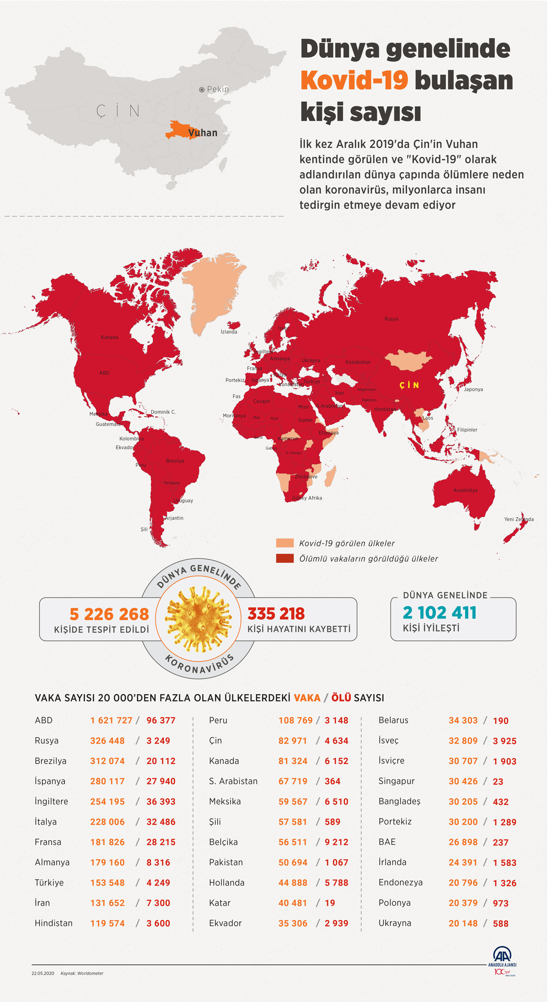 Çin'in Hubey eyaletine bağlı Vuhan kentinde ortaya çıkan yeni tip koronavirüsün (Kovid-19) dünya genelinde bulaştığı kişi sayısı 5 milyon 198 bini aştı. ( Ahmet Burak Özkan - Anadolu Ajansı )